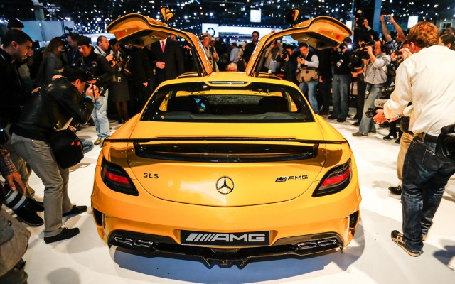 2014 Mercedes-Benz SLS AMG Black Series – นี่เป็นซูเปอร์คาร์ตัวใหม่ล่าสุดอีกคันที่พึ่งจะเปิดตัวที่งาน 2012 LA Auto Show ที่ผ่านมานี้เอง ซึ่งรถรุ่นนี้เปรียบเสมือน bad boy ในกลุ่ม SLS โดย  SLS AMG Black Series ตัวนี้มาพร้อมกับขุมพลังที่แรงมาก 622 แรงม้า สามารถรีดความเร็วสูงสุดถึง 315 กิโลเมตรต่อชั่วโมง ( 196ไมล์ต่อชั่วโมง) อัตราเร่งจาก 0-100 กิโลเมตรต่อชั่วโมง ในเวลา 3.5 วินาที ที่พิเศษคือน้ำหนักของตัวรถลดลงกว่า  70 kg (หรือประมาณ 150 lb) เมื่อเทียบกับตัวมาตรฐานของ SLS AMG ซึ่งน้ำหนักที่ลดลงส่วนหนึ่งมาจากที่ทาง AMG ตั้งใจที่จะใส่คาร์บอนไฟเบอร์มาเป็นส่วนประกอบที่สำคัญของตัวรถ ทั้งภายนอกเเละภายในเราจะเห็นคาร์บอนไฟเบอร์เป็นส่วนประกอบทั้งนั้น ซึ่งจากเดิมเราจะเห็นลักษณะส่วนประกอบที่เป็นคาร์บอนไฟเบอร์มากขนาดนี้ในรถ Koenigsegg