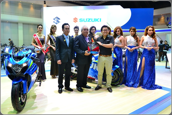 บริษัท ไทยซูซูกิมอเตอร์ จำกัด เข้าร่วมงานมหกรรมยานยนต์ ครั้งที่ 36 Bangkok International Motor Show บูธซูซูกิปีนี้มาภายใต้คอนเซ็ปต์ “RACING SPIRIT” รับรางวัล The Best Design Award 2015 โดยมี มร.โคทะ ทาโอกะ ผู้ช่วยผู้อำนวยการ บริษัท ไทยซูซูกิมอเตอร์ จำกัด รับมอบโล่รางวัลจาก ดร.ปราจิน เอี่ยมลำเนา ประธานจัดงาน และคุณจาตุรนต์ โกมลมิศร์ ณ บูธซูซูกิบิ๊กไบค์ อิมแพค เมืองทองธานี |