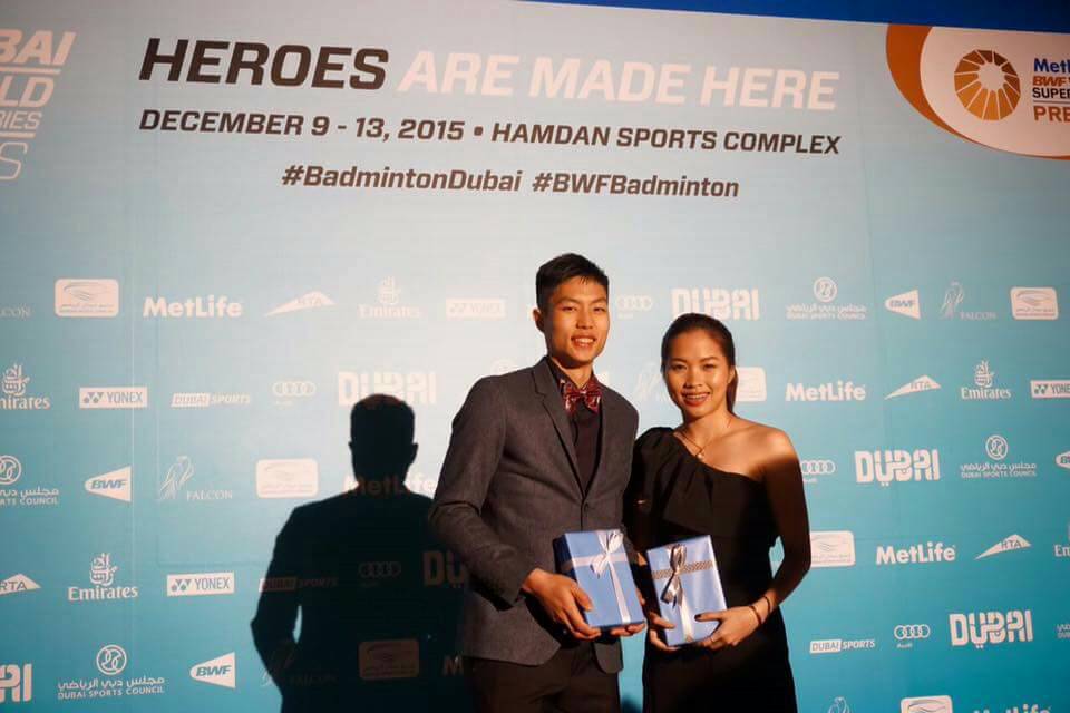 รัชนก อินทนนท์ หรือ น้องเมย์ และโจเทียนเฉิน ในงานกาล่าดินเนอร์ ได้รับรางวัลแต่งกายยอดเยี่ยม ในรายการ DuBai Superseries Finai 2015 วันที่ 7 ธันวาคม 2558