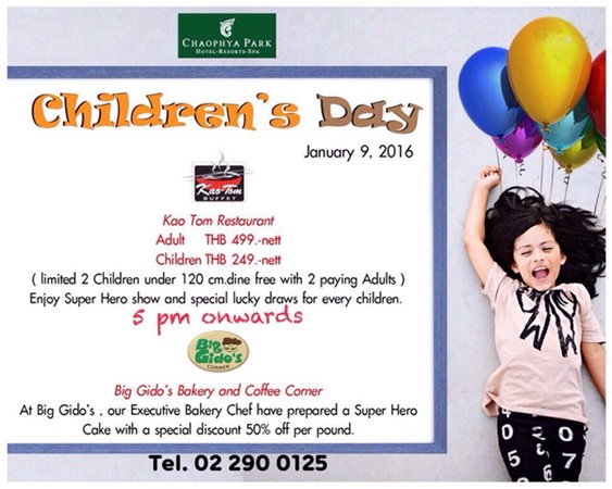 ห้องอาหารข้าวต้มบุฟเฟ่ต์ - โรงแรมเจ้าพระยาปาร์ค ชวนคุณหนูๆและครอบครัว ร่วมต้อนรับวันเด็ก (เสาร์ที่ 9 มกราคมนี้) กับโปรโมชั่น อิ่มสุขกันทั้งครอบครัว สำหรับเด็กที่มีส่วนสูงไม่เกิน 120 ซม. ทานฟรี!(ครอบครัวละ 2 คน) ตั้งแต่เวลา 17.00 น. พร้อมซุ้มลูกโป่ง, ของรางวัล และตัวการ์ตูนซุปเปอร์ ฮีโร่ ที่จะมาสร้างสีสันวันเด็กให้สนุกยิ่งขึ้น นอกจากนั้นยังได้ Cup cake กลับบ้านทุกคน