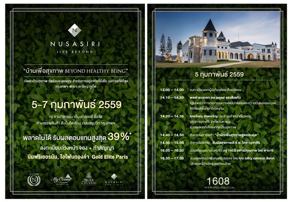 บริษัท ณุศาศิริ จำกัด (มหาชน) เชิญชวนทุกท่านร่วมเปิดตัวบ้านสุขภาพที่พร้อมดูแลคุณ สำหรับการอยู่อาศัยที่ยั่งยืน บนทำเลที่ดีที่สุด กรุงเทพฯ-พัทยา-เขาใหญ่-ภูเก็ต พร้อมรับผลตอบแทนจากการลงทุนสูงสุด 39%