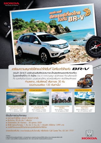 กรุงเทพฯ – บริษัท ฮอนด้า ออโตโมบิล (ประเทศไทย) จำกัด จัดกิจกรรมแรลลี่ “อัศจรรย์เที่ยวไทยไปกับ BR-V” ชวนลูกค้าผู้ใช้รถยนต์ฮอนด้า บีอาร์-วี ร่วมกิจกรรมและสัมผัสประสบการณ์ใหม่ที่คุณอาจไม่เคยได้สัมผัสมาก่อน ในเส้นทาง unseen 4 ภาคทั่วไทย ตลอดเดือนพฤศจิกายน รวม 120 คัน พร้อมเปิดรับสมัครทุกเส้นทางตั้งแต่วันนี้ – 20 ตุลาคม 2559