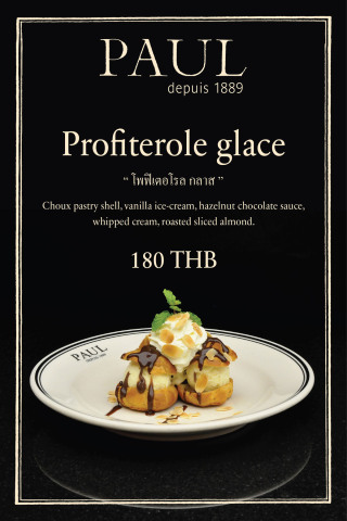 พอล “PAUL” เฟรนซ์เบเกอรี่ และเรสเตอร์รองระดับโลก ผู้ดำเนินธุรกิจร้านอาหารและเบเกอรี่สไตล์ฝรั่งเศสแบบดั้งเดิม มากว่า 127 ปี ขอเชิญคุณสัมผัสกับเมนูใหม่ ‘Profiterole Glace’ (โพ-ฟิ-เตอ-โรล-กลาส) สวรรค์ของคนรัก “ของหวาน” ไอศครีมวนิลาหอมหวานประกบด้วยแป้งชูวส์(Choux Pastry Shell) หอมกรุ่นสดใหม่ ราดด้วยซอสช็อคโกแลตฮาเซลนัท (Hazelnut Chocolate Sauce) แต่งหน้าด้วย วิปครีม(Whipped Cream) และอัลมอนด์สไลด์อบหอมกรุ่น (Roasted Sliced Almond) ในราคาเพียง 180 บาท