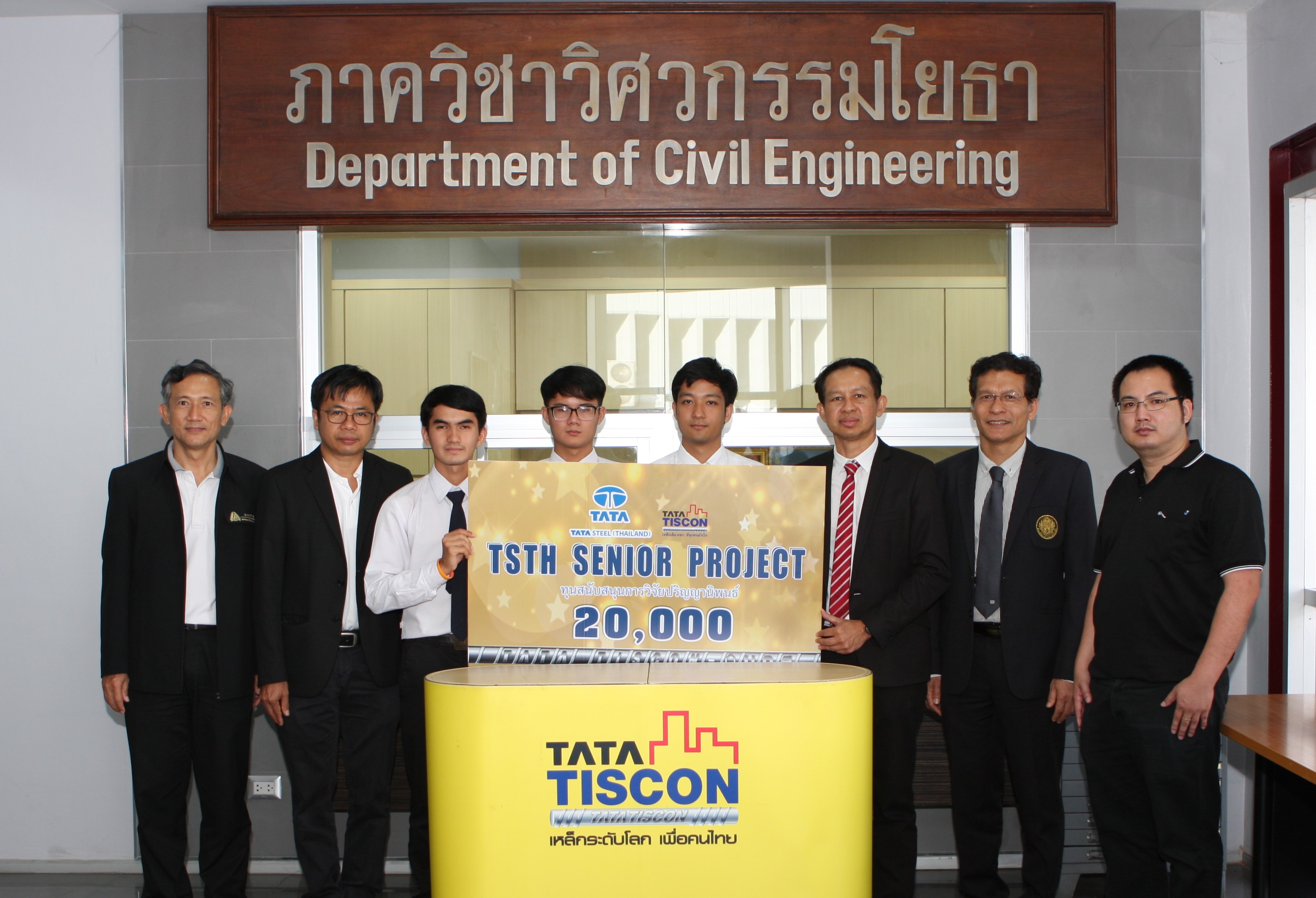 บริษัท ทาทา สตีล (ประเทศไทย) จำกัด (มหาชน) ผู้ผลิตและจำหน่ายเหล็กทรงยาวรายใหญ่ที่สุดในประเทศไทย โดย คุณชัยเฉลิม บุญญานุวัตร (ที่ 3 จากขวา) ผู้ช่วยกรรมการผู้จัดการใหญ่ - การตลาดและการขาย มอบทุนสนับสนุนการวิจัยปริญญานิพนธ์ (Senior Project)” ประจำปี 2559 จำนวน 20,000 บาท ให้แก่ นักศึกษา ภาควิชาวิศวกรรมโยธา คณะวิศวกรรมศาสตร์ มหาวิทยาลัยเทคโนโลยีพระจอมเกล้าพระนครเหนือ ได้แก่ นายณัฐวุฒิ ช่วยศรี นายศุภกิจ ภักดี นายวรพล เฟื่องรอด ทีมผู้วิจัย (ที่ 3, 4, 5 จากซ้าย) โดยมี