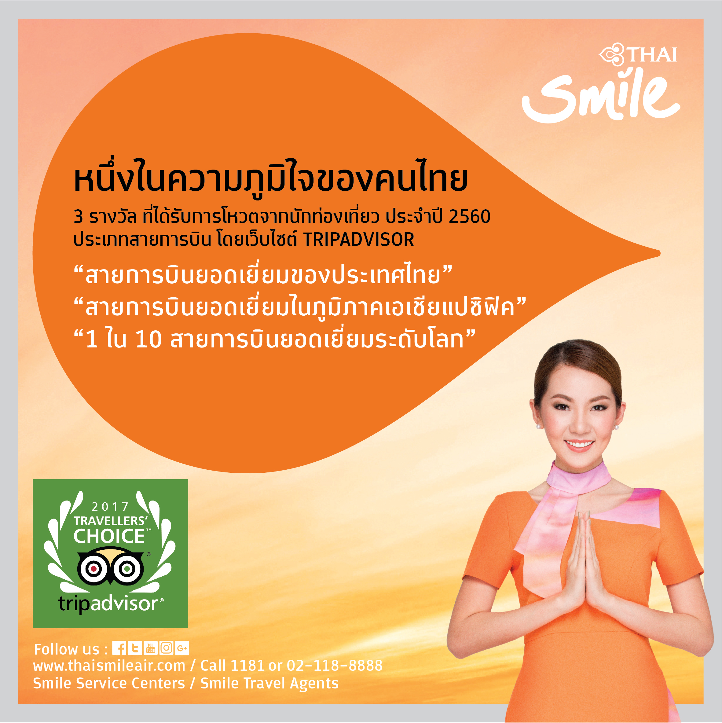 สายการบินไทยสมายล์ สร้างชื่อเสียงให้ประเทศไทยอีกครั้งด้วยการคว้า 3 รางวัลใหญ่ ได้แก่ รางวัลสายการบินยอดเยี่ยมของประเทศไทย ควบอีก 2 รางวัลในระดับภูมิภาคเอเชียแปซิฟิกและระดับโลก ได้แก่ สายการบินยอดเยี่ยมในภูมิภาคเอเชียแปซิฟิก และ 1 ใน 10 สายการบินยอดเยี่ยมระดับโลก จากการรีวิวของผู้โดยสารทั่วโลก ประจำปี 2560 ประเภทสายการบิน โดยเว็บไซต์ TripAdvisor ซึ่งเป็นเว็บไซต์ด้านการท่องเที่ยวชื่อดังที่มีฐานผู้ใช้งานกว่า 350 ล้านคนทั่วโลก ตอกย้ำความเป็นสายการบินภูมิภาคชั้นนำของทวีปเอเชีย ลั่นเดินหน้าพัฒนาบริการระดับเวิลด์คลาสไม่หยุดยั้ง เพื่อตอบสนองทุกความต้องการของนักเดินทาง เปิดประสบการณ์ใหม่บนเส้นทางบินใหม่ๆ ให้กับนักท่องเที่ยวและสร้างความประทับใจให้กับผู้โดยสารอย่างต่อเนื่อง