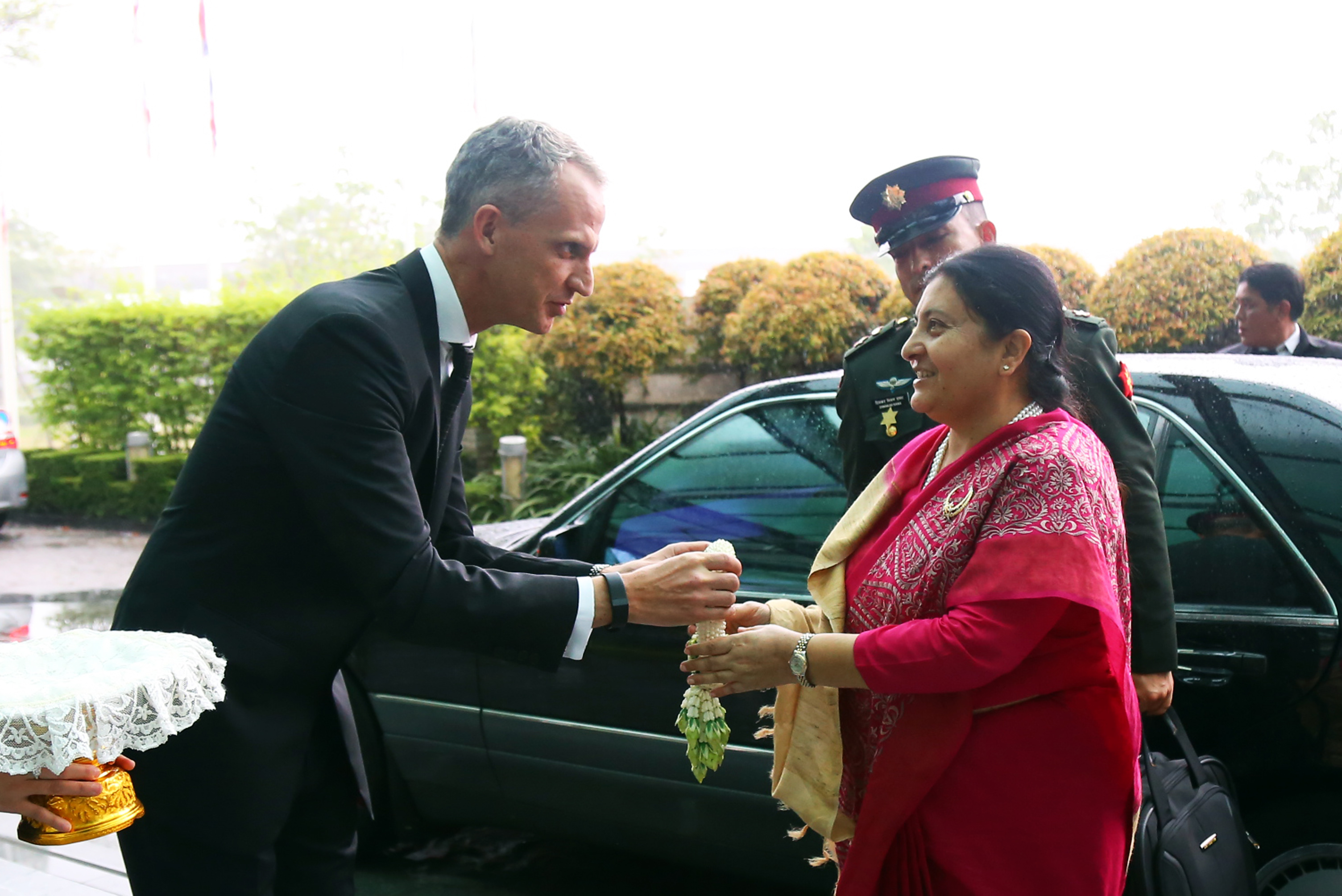 โนโวเทล สุวรรณภูมิ แอร์พอร์ตต้อนรับประธานาธิบดีเนปาล เมื่อเร็วๆนี้ เจอราลด์ ฮูกาดี้ (ซ้าย) ผู้จัดการ โรงแรมโนโวเทล สุวรรณภูมิ แอร์พอร์ต ให้การต้อนรับ พิทยา เทวี บันดารี (ขวา) ประธานาธิบดีหญิงคนแรกของประเทศเนปาล ในโอกาสมาเยือนประเทศไทยเพื่อถวายสักการะพระบรมศพพระบาทสมเด็จพระปรมินทรมหาภูมิพลอดุลยเดชและเข้าพักที่โรงแรมฯ