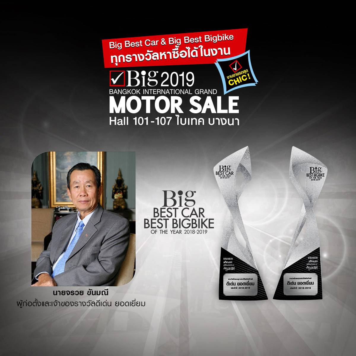 นายจรวย ขันมณี ประธานกรรมการบริหาร ยานยนต์สแควร์ กรุ๊ป ผู้ก่อตั้งและเจ้าของรางวัล Big Best Car of The Year และ Big Best BigBike of The Year เผยว่า “สำหรับรางวัล Big Best Car of The Year และ Big Best BigBike of The Year นั้น เป็นการประกาศความเป็นผลิตภัณฑ์ “ดีเด่น ยอดเยี่ยม” ประจำปีสำหรับรถยนต์ รถอเนกประสงค์ และ มอเตอร์ไซค์บิ๊กไบค์ ที่มีการจำหน่ายระหว่างเดือนกรกฎาคม พ.ศ. 2561 จนถึงเดือนมิถุนายน พ.ศ. 2562 จากการทำงานด้านเทคนิคและทดลองขับขี่ของบรรณาธิการบริหาร บรรณาธิการฝ่ายเทคนิคของนิตยสารในกลุ่ม ซึ่งพิจารณาข่าวสารด้วยมุมมองของ “ผู้รู้” ตลอดจนกลั่นกรองความคิดเห็นจากคณะกรรมการฝ่ายประกาศรางวัล โดยแบ่งเป็น Big Best Car of The Year 2018-2019 ดีเด่น ยอดเยี่ยม 23 รางวัล และ Big Best BigBike of The Year 2018-2019 ดีเด่น ยอดเยี่ยม 10 รางวัล รวมทั้งสิ้น 33 รางวัล ซึ่งไม่เพียงสร้างความภาคภูมิใจให้กับแต่ละ แบรนด์เท่านั้น แต่ยังเป็นข้อมูลสำคัญที่ผู้บริโภคสามารถนำมาใช้เป็นแนวทางในการเลือกสรรและซื้อหารถคันใหม่หรือบิ๊กไบค์คันใหม่ให้เหมาะสมกับการใช้งาน โดยทุกแบรนด์สามารถหาชมและสั่งจองสั่งซื้อได้ในงาน Big Motor Sale 2019 ระหว่างวันที่ 16 – 25 สิงหาคม 2562 ที่ ไบเทค บางนา”