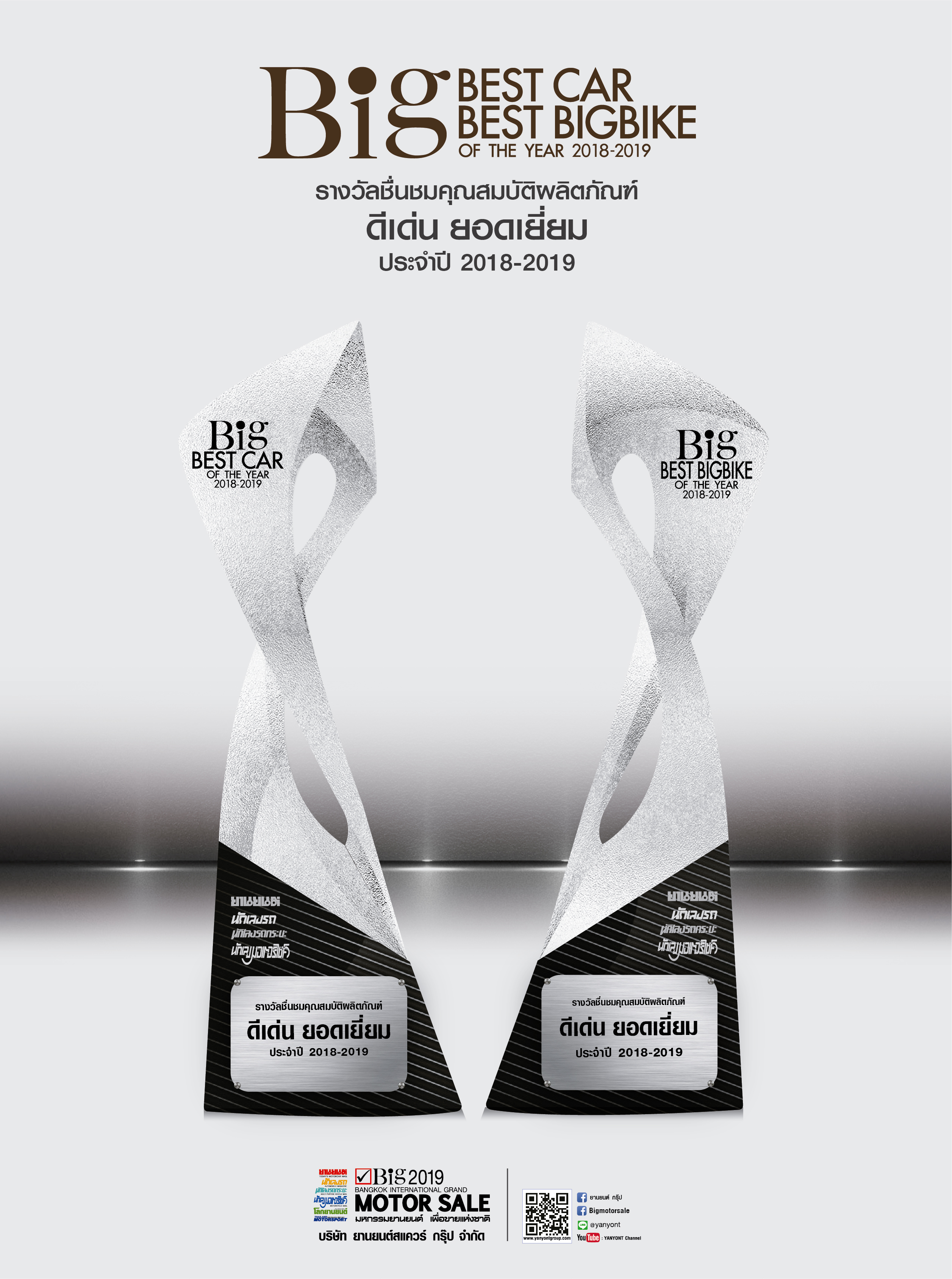 สำหรับผลรางวัล Big Best Car of The Year 2018-2019 และ Big Best BigBike of The Year 2018-2019 มีดังนี้ Big Best Car of The Year 2018-2019 ดีเด่นยอดเยี่ยม 23 รางวัล ได้แก่ • รางวัล Premium SUV ดีเด่น ยอดเยี่ยม ได้แก่ AUDI Q 7 45 TFSI quattro S-Line สวยหรูหรา เทคโนโลยีทันสมัย ช่วงล่างสุดเทพ • รางวัล Compact Sedan ดีเด่น ยอดเยี่ยม ได้แก่ BMW 320d Sport สปอร์ตหรู มีเอกลักษณ์ เครื่องยนต์ดีเซลเทอร์โบสมรรถนะน่าพอใจพร้อมความประหยัด • รางวัล PPV 7 ที่นั่งสมรรถนะดีเด่น ยอดเยี่ยม ได้แก่ New FORD Everest 2.0 L Titanium+ 4x4 เครื่องยนต์ 2.0 ลิตร 213 แรงม้า เกียร์อัตโนมัติ 10 Speed พร้อมการปรับช่วงล่างใหม่ • รางวัลปิคอัพขับสอง-ยกสูง 2.0 ลิตรดีเด่น ยอดเยี่ยม ได้แก่ FORD Ranger Double Cab Hi-Rider 2.0L Turbo 10AT Limited เครื่องยนต์ 2.0 ลิตร เทอร์โบเดี่ยว 180 แรงม้า เกียร์อัตโนมัติ 10 Speed นุ่มหนึบ ขับดี • รางวัล Mid-size Sedan ดีเด่น ยอดเยี่ยม ได้แก่ HONDA Accord 1.5 Turbo EL เทคโนโลยีทันสมัย ขับสบาย เครื่องยนต์เล็กพลังสูง อัตราเฉลี่ยเชื้อเพลิงน่าพอใจ • รางวัล MPV คู่ใจนักเดินทาง ดีเด่น ยอดเยี่ยม ได้แก่ HYUNDAI H-1 Deluxe ได้รับความ นิยมสูงสุดในกลุ่ม ปรับโฉมด้านหน้า เพิ่มความสะดวกสบาย ขับดีใช้งานได้คุ้มค่าตัว • รางวัลปิคอัพขับสอง-ยกสูงดีเด่น ยอดเยี่ยม ได้แก่ ISUZU D-Max Stealth 1.9 Ddi Blue Power ด้วยเครื่องยนต์ดีเซล 1.9 ลิตรที่ให้อัตราเร่งเหนือเครื่องยนต์ที่ใหญ่กว่าบางรุ่น อีกทั้งยังมีความประหยัดดีที่สุด ในระดับ 19.21 กม./ลิตร • รางวัล PPV 7 ที่นั่งสุดประหยัดดีเด่น ยอดเยี่ยม ได้แก่ ISUZU MU-X The Onyx 3.0 Ddi Blue Power มาพร้อมระบบช่วยการขับขี่หลากหลาย ในราคาที่ต่ำกว่า โดยเครื่องยนต์ดีเซล 3.0 ลิตรจะมีสมรรถนะไม่แพ้ใคร และโดดเด่นด้วยความประหยัดดีที่สุดในกลุ่มจากอัตรา 18.92 กม./ลิตร • รางวัล Premium MPV ดีเด่น ยอดเยี่ยม ได้แก่ KIA Grand Carnival รถ MPV มาดสปอร์ต สมรรถนะสูง ใช้งานได้คล่องตัว หลากหลาย • รางวัล Super Sport Sedan ดีเด่น ยอดเยี่ยม ได้แก่ MASERATI Quattroporte สปอร์ตซีดานใหญ่ หรู ทรงพลัง • รางวัล Sport Roadster ดีเด่น ยอดเยี่ยม ได้แก่ MAZDA MX-5 RF โรดสเตอร์เครื่องแรงขับสนุก หลังคาแข็งพับได้ • รางวัล Compact SUV หรูหราสำหรับครอบครัว ดีเด่น ยอดเยี่ยม ได้แก่ MERCEDES-BENZ GLC 250d 4MATIC Off-Road ให้ครบทั้งประสิทธิภาพและสมรรถนะ รวมทั้งความประหยัดของเครื่องดีเซล • รางวัล Subcompact SUV BEV ดีเด่น ยอดเยี่ยม ได้แก่ MG ZS EV หัวใจใหม่ในการขับเคลื่อน เป็นมิตรต่อสิ่งแวดล้อม ราคาคุ้มค่าน่าคบ • รางวัลรถเล็กเร้าใจ ดีเด่น ยอดเยี่ยม ได้แก่ MINI Cooper S Hatch รถเล็กไฮเทคสมรรถนะเร้าใจ ดูดีมีรสนิยม • รางวัล Subcompact Crossover MPV สำหรับครอบครัว ดีเด่น ยอดเยี่ยม ได้แก่ MITSUBISHI Xpander GT แนวใหม่ของรถ Crossover MPV 7 ที่นั่งขนาดกำลังเหมาะสำหรับครอบครัว ดีไซน์แปลกตาน่าสนใจ ขับสบายใช้งานดีตอบสนองเด่น • รางวัลปิคอัพขับเคลื่อนสี่ล้อ ดีเด่น ยอดเยี่ยม ได้แก่ MITSUBISHI Triton 4x4 ด้วยเครื่องยนต์ดี