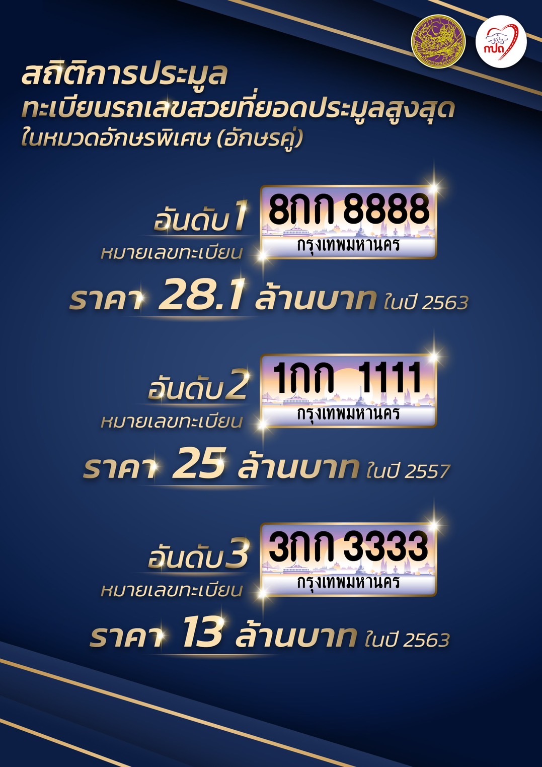 ข้อมูลสถิติการประมูลทะเบียนรถเลขสวยของกรมการขนส่งทางบก หมายเลขทะเบียนที่ได้รับความนิยมยังคงเป็นหมายเลขทะเบียนรถในหมวดอักษรพิเศษ (อักษรคู่) เช่น “กก” ซึ่งมูลค่าการประมูลสูงสุด อันดับที่ 1 เป็นหมายเลขทะเบียน “8กก 8888” ราคา 28.1 ล้านบาท ในปี 2563 อันดับที่ 2 หมายเลขทะเบียน “1กก 1111” ราคา 25 ล้านบาท ในปี 2557 และอันดับที่ 3 หมายเลขทะเบียน 3กก3333 ราคา 13 ล้านบาท ในปี 2559