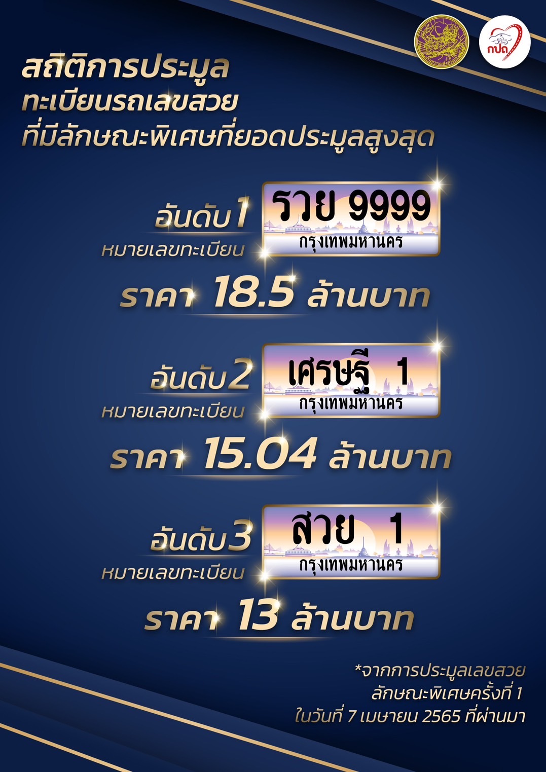 เปิดสถิติป้ายทะเบียนเลขสวยมูลค่าสูง เทรนด์มาแรงที่นักลงทุนแย่งกันประมูล การประมูล “ทะเบียนรถเลขสวย” สำหรับรถยนต์นั่งส่วนบุคคลไม่เกิน 7 คน หรือที่เรียกกันทั่วไปว่า “รถเก๋ง” นั้น เริ่มเปิดประมูลมาตั้งแต่ปี พ.ศ. 2546 เป็นต้นมา ประกอบด้วย ตัวอักษรประจำหมวด+เลขทะเบียน เช่น กก 1234, กค 888, 1กข 6789 เป็นต้น ต่อมาในปี พ.ศ. 2565 ได้มีการเปิดประมูล“ทะเบียนรถเลขสวยที่มีลักษณะพิเศษ” เพิ่มขึ้น ซึ่งถือว่าเป็นนวัตกรรมด้านการประมูลทะเบียนรถเลขสวย โดย “ทะเบียนรถเลขสวยที่มีลักษณะพิเศษ” จะมีความแตกต่างจาก “ทะเบียนรถเลขสวย”ลักษณะปกติ คือ ตัวอักษรประจำหมวด ของ “ทะเบียนรถเลขสวยที่มีลักษณะพิเศษ”จะเป็นคำหรือข้อความที่มีความหมายแล้ว ตามด้วยเลข เช่น รวย 888, เศรษฐี 9, เจริญ 999, โชค 9999 เป็นต้น
