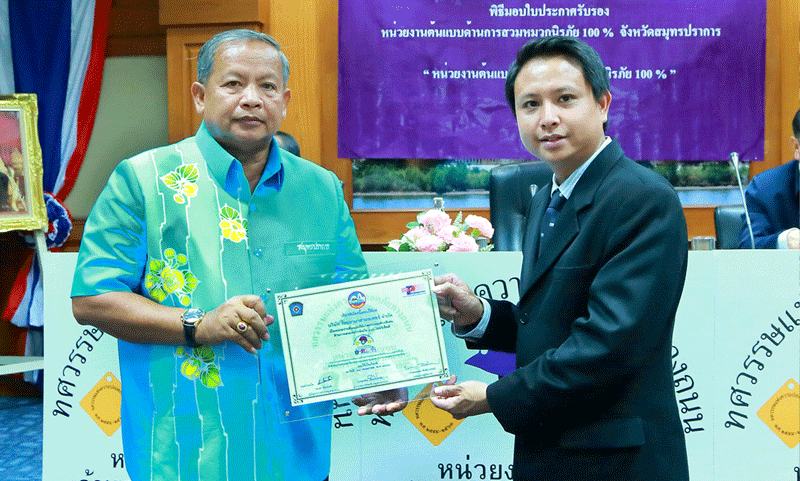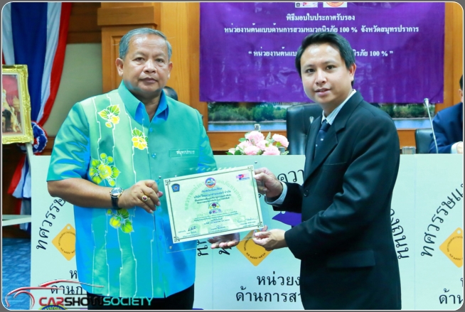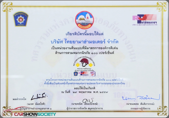 นายการันต์ ศรีทองสุข ผู้จัดการอาวุโสแผนกบริหารงานสำนักงาน บริษัท ไทยยามาฮ่ามอเตอร์ จำกัด (คนขวา) เข้ารับใบประกาศเกียรติบัตร ในฐานะการเป็นหน่วยงานต้นแบบที่มีมาตรการองค์กรดีเด่นด้านการสวมหมวกนิรภัย 100 เปอร์เซ็นต์ ในโครงการหน่วยงานต้นแบบ ด้านการสวมหมวกนิรภัย 100 เปอร์เซ็นต์ โดยมีนายคณิต เอี่ยมระหงษ์ ผู้ว่าราชการจังหวัดสมุทรปราการ ให้เกียรติเป็นผู้มอบใบประกาศเกียรติบัตรฯ ณ ศาลากลางจังหวัดสมุทรปราการ เมื่อเร็วๆ นี้ ![]() ![]() |