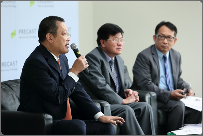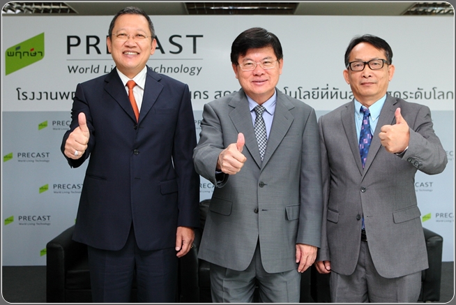 โชว์สุดยอดเทคโนโลยี Precast ทันสมัยระดับโลก 27 พฤศจิกายน 2557 – พฤกษา เรียลเอสเตท พร้อมเดินเครื่องผลิตชิ้นส่วนคอนกรีตเสริมเหล็กสำเร็จรูปที่โรงงานพฤกษาพรีคาสท์ใหม่ ย่านนวนคร นำสุดยอดเทคโนโลยีจากเยอรมนีมาใช้ เพื่อส่งมอบบ้านคุณภาพให้กับลูกค้า นายทองมา วิจิตรพงศ์พันธุ์ ประธานกรรมการบริหารและกรรมการผู้จัดการใหญ่ บริษัท พฤกษา เรียลเอสเตท จำกัด (มหาชน) เปิดเผยว่า เพื่อรองรับการเข้าร่วมประชาคมเศรษฐกิจอาเซียน (AEC)และการลงทุนในระบบโครงสร้างพื้นฐานด้านคมนาคมของประเทศไทย ซึ่งจะส่งผลต่อการเจริญเติบโตทางเศรษฐกิจ และจะก่อให้เกิดการกระจายตัวของที่พักอาศัยของพี่น้องประชาชน บริษัทฯ จึงได้ลงทุนรวม 2,300 ล้านบาท เพื่อสร้างโรงงานพฤกษา พรีคาสท์ แห่งใหม่ จำนวน 2 โรงงานที่นวนคร โดยปัจจุบันการก่อสร้างได้คืบหน้าไปกว่า 80% แล้วและเพื่อให้การผลิตชิ้นส่วนคอนกรีตเสริมเหล็กสำเร็จรูป เป็นส่วนหนึ่งในการก่อสร้างบ้านในโครงการต่างๆ ของบริษัทฯ สำหรับโรงงานใหม่ทั้ง 2 โรง ได้เริ่มต้นการผลิตแล้วบางส่วนเมื่อเดือนกันยายนโดยมีกำลังการผลิตบ้านได้ประมาณ480 หลังต่อเดือน และเมื่อรวมกับโรงงานเดิมจำนวน 5 โรงงานที่ลำลูกกา ซึ่งมีกำลังผลิต 640 หลังต่อเดือน จะทำให้บริษัทฯ มีกำลังการผลิตรวมสูงถึง1,120 หลังต่อเดือน ซึ่งจะสอดคล้องกับแผนการเปิดโครงการใหม่ และแผนการส่งมอบบ้านคุณภาพให้กับลูกค้าที่เพิ่มสูงขึ้นในแต่ละปี “พฤกษา ให้ความสำคัญอย่างมากในเรื่องการปรับปรุงคุณภาพบ้านเพื่อส่งมอบให้กับลูกค้า จึงมุ่งเน้นสร้างสรรค์นวัตกรรมใหม่ๆ อย่างต่อเนื่องกันมา โดยในปี 2545 บริษัทฯ เริ่มนำเทคโนโลยีพฤกษา พรีคาสต์(Pruksa Precast)มาใช้ในการก่อสร้างที่อยู่อาศัยแนวราบต่อมาปี 2555 ได้คิดค้นนวัตกรรมการสร้างบ้านคุณภาพในรูปแบบเหมือนแบบอุตสาหกรรม (PruksaReal Estate Manufacturing) และต่อมาปี 2557 จึงได้นำห้องน้ำสำเร็จรูปมาใช้ในโครงการคอนโดมิเนียมความสูงไม่เกิน 8 ชั้น โดยมีหน่วยงาน Pruksa Innovation Center ทำหน้าที่ค้นหานวัตกรรมใหม่ๆ ทั้งในด้านกระบวนการ วัสดุ และวิธีการเพื่อนำมาประยุกต์ใช้ ให้บ้านซึ่งถือเป็น 1 ในปัจจัย 4 และเป็นบ้านของลูกค้ามีคุณภาพและครอบคลุมถึงการมีชุมชนที่มีสิ่งแวดล้อมที่ดีตามนโยบายของบริษัทฯ ที่มุ่งเน้นต่อเนื่องกันมาตลอดกว่า 21 ปี ในการดำเนินธุรกิจ” ด้านนายเลอศักดิ์ จุลเทศ รองประธานกรรมการบริหารและกรรมการผู้อำนวยการ กล่าวว่า“โรงงานพฤกษา พรีคาสท์ แห่งใหม่ ที่นวนครเป็น Green Factoryแห่งแรกของประเทศไทย ที่ช่วยลดมลภาวะเรื่องเสียงฝุ่นและน้ำเสียฯ โดยใช้เทคโนโลยีและเครื่องจักรที่ทันสมัยที่ส
