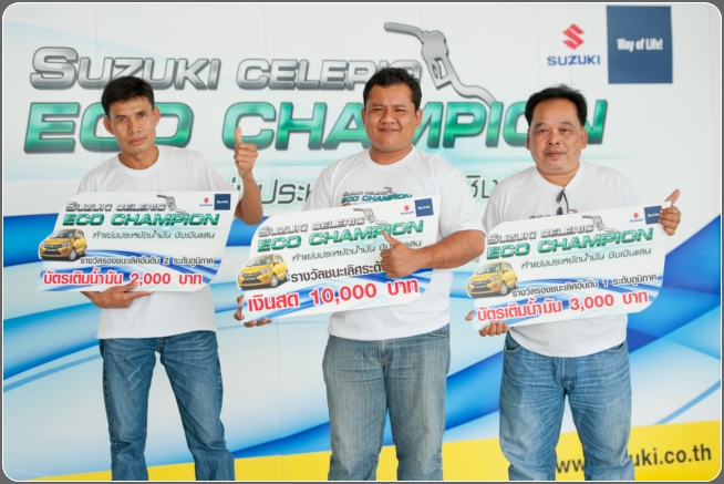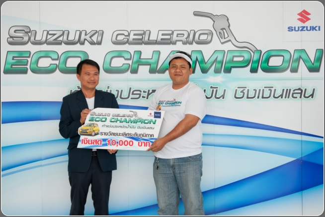 “SUZUKI CELERIO Eco Champion”การแข่งขันเฟ้นหาที่สุดของผู้ใช้ ซูซูกิ เซเลริโอ้ ตัวจริง ที่สามารถขับประหยัดน้ำมันได้เป็นเลิศเน้นการขับบนท้องถนนจริงในสภาพการจราจรปกติด้วยระยะทางการแข่งขัน 50 กิโลเมตรกำหนดเวลาในการแข่งขัน1 ชั่วโมง 30 นาที ซึ่งเป็นกิจกรรมเพื่อสานสัมพันธ์อันดีระหว่างบริษัทฯ และลูกค้า โดยเปิดโอกาสผู้ใช้รถยนต์ ซูซูกิ เซเลริโอ้ ได้ประลองความสามารถในรูปแบบใหม่ ผ่านการสร้างสถิติการขับประหยัดน้ำมันด้วยรถคู่ใจ และเทคนิคการขับประหยัดของลูกค้าเอง โดยกำหนดให้รถที่ใช้ในการแข่งขันต้องเป็นเครื่องยนต์มาตรฐานจากโรงงาน ห้ามไม่ให้มีการปรับแต่งใดๆ เพื่อเป็นการพิสูจน์ความมั่นใจให้ประจักษ์ต่อสาธารณชนว่าซูซูกิ เซเลริโอ้ เป็นอีโคคาร์ ที่มีสมรรถนะเกินตัว และมีความเป็นเลิศในเรื่องการประหยัดน้ำมันสำหรับการแข่งขันในสนามนี้อุปสรรคที่ท้าทายผู้เข้าแข่งขันนับว่าหินอยู่ไม่น้อย มีทั้งสภาพอากาศที่ร้อยระอุ การจราจรที่ติดขัดสมเป็นเมืองใหญ่ แต่ผู้เข้าแข่งขันทุกคนต่างก็ดึงกลเม็ดและใช้เทคนิคส่วนตัวที่ศึกษาเรื่องการขับประหยัดน้ำมันมาเป็นอย่างดีสามารถพิชิตอุปสรรคทั้งหลายสร้างอัตราสิ้นเปลืองเฉลี่ยจากผู้เข้าแข่งขันทั้งหมดได้ถึง 65.35 กิโลเมตร/ลิตร โดยผู้ที่สามารถสร้างสถิติอัตราสิ้นเปลืองเชื้อเพลิงได้ดีที่สุด คว้าตำแหน่งผู้ชนะเลิศรอบภูมิภาคประจำภาคตะวันออก ได้แก่ คุณวุฒิศักดิ์ คำสุดอันดับที่ 2 ได้แก่ คุณอำนวย มณีศรีและอันดับที่ 3 ได้แก่ คุณสมจิต ดงเล็ก โดยผู้ชนะทั้งสามอันดับของทุกภูมิภาคจะได้เป็นตัวแทนไปท้าชิงเงินรางวัล 100,000 บาท ในรอบชิงชนะเลิศระดับประเทศต่อไป
