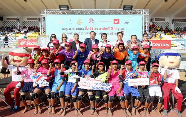 กิจกรรม “สพฐ.-เอ.พี. ฮอนด้า วิ่ง 31 ขาสามัคคี ปีที่ 11" รอบชิงแชมป์ภาคอีสาน สุดยิ่งใหญ่ ผู้ว่าฯ ขอนแก่นชี้กีฬาดีที่ควรสนับสนุน และยังเกิดกระแสฟีเวอร์ข้ามแดน ดีลเลอร์ ผู้จำหน่ายรถจักรยานยนต์ฮอนด้า จาก สปป.ลาว นำคณะอาจารย์ ตัวแทนหน่วยงานภาครัฐ กว่า 40 ชีวิต ลัดฟ้ามาดูงานการแข่งขันรอบภูมิภาค ภาคอีสาน ที่สนามกีฬากลาง จ.ขอนแก่น ระหว่างวันที่ 19-20 ธ.ค.58 เพื่อหวังเก็บประสบการณ์กลับไปฝึกฝนเด็กของตนแล้วส่งชิงชัยในปีหน้า โดยครั้งนี้มีนักกีฬากว่า 3,800 คน จากทั่วภาคตะวันออกเฉียงเหนือ แห่ประชันฝีเท้า ลุ้นติด 11 ทีมสุดท้ายที่มีสถิติดีที่สุดผ่านเข้าสู่รอบชิงแชมป์ประเทศไทย