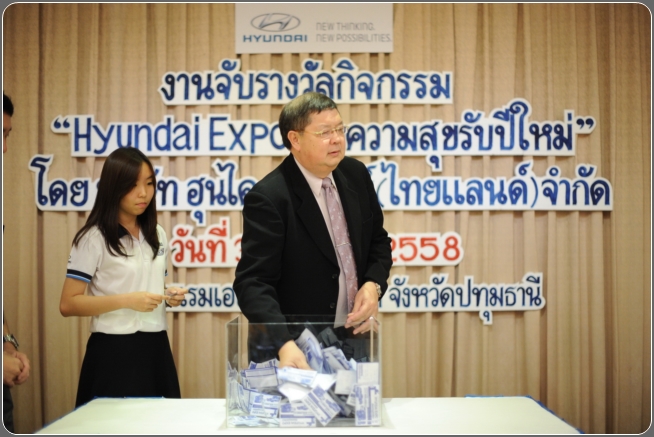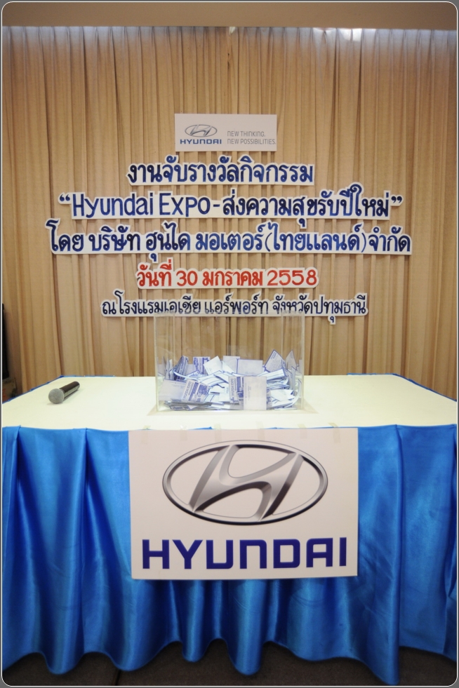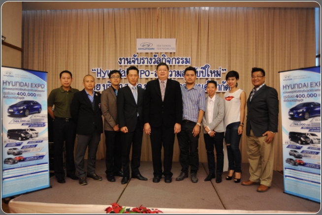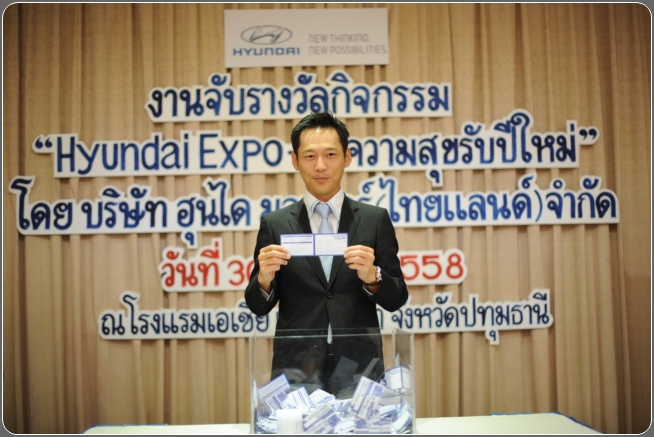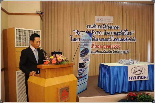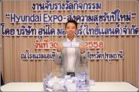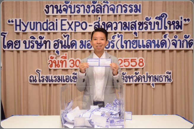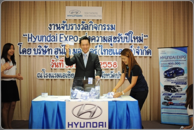 2กุมภาพันธ์2558–เมื่อวันที่ 30 มกราคม 2558บริษัท ฮุนได มอเตอร์ (ไทยแลนด์) จำกัด ได้จัดงานมอบรางวัลให้แก่ผู้โชคดีจากแคมเปญ “Hyundai Expo ส่งความสุขรับปีใหม่” โดยมี มร. โยชิกาซึ โคนิชิ ผู้จัดการทั่วไป เป็นประธานในการจับรางวัลมอบโชค พร้อมได้รับเกียรติจากสื่อมวลชนอาวุโสและแขกผู้มีเกียรติร่วมจับรางวัลและเป็นสักขีพยานในกิจกรรม ณ โรงแรมเอเชีย แอร์พอร์ต (เซียร์รังสิต)จ.ปทุมธานีแคมเปญพิเศษ “Hyundai Expo ส่งความสุขรับปีใหม่” จัดขึ้นเพื่อเปิดโอกาสให้ลูกค้าที่จองรถยนต์ฮุนไดทุกรุ่นจากโชว์รูมรถยนต์ฮุนไดทั่วประเทศ และในงานมหกรรมยานยนต์ครั้งที่ 31 Thailand International Motor Expo 2014 ในช่วงระหว่างวันที่ 22 พ.ย 57 จนถึงวันที่ 30 ธ.ค. 57 ได้มีสิทธิ์ในการส่งคูปองชิงรางวัลเพื่อลุ้นรับบัตรของขวัญกว่า 30 รายการ รวมมูลค่า 400,000 บาท ซึ่งลูกค้าต่างให้การตอบรับกันอย่างดีมาก ส่งผลให้ยอดจองในช่วงก่อนและระหว่างงานมหกรรมยานยนต์ครั้งที่ 31 มียอดเพิ่มสูงขึ้นอย่างต่อเนื่อง และมีลูกค้าเข้าร่วมแคมเปญส่งคูปองชิงโชคมาร่วมลุ้นรางวัลจำนวนกว่า 700 ใบ มร.โยชิกาซึ โคนิชิ ผู้จัดการทั่วไป บริษัท ฮุนได มอเตอร์ (ไทยแลนด์) จำกัด กล่าวว่า “ผมขอแสดงความยินดีกับผู้โชคดีทุกท่านที่ได้รับรางวัลจากแคมเปญ “Hyundai Expo ส่งความสุขรับปีใหม่” ในครั้งนี้ โดยกิจกรรมนี้เราจัดขึ้นเพื่อเป็นการขอบคุณลูกค้าที่ให้ความไว้วางใจ เลือกใช้รถยนต์ฮุนได และถือเป็นช่วงเวลาที่ดีที่จะส่งความสุขให้ลูกค้าในช่วงเทศกาลปีใหม่ ซึ่งในโอกาสหน้าเรายังคงมุ่งมั่นที่จะสร้างสรรค์กิจกรรมดีๆให้กับลูกค้า ทั้งในด้านแคมเปญพิเศษหรือสิทธิประโยชน์ต่างๆที่ลูกค้าจะได้รับมากขึ้น เพื่อเป็นการตอบแทนและขอบคุณในความเชื่อมั่นที่มีให้กับเรามาโดยตลอด” สำหรับรางวัลที่มอบในครั้งนี้มีด้วยกันทั้งสิ้น 4 รางวัล รางวัลที่ 1 คือ บัตรของขวัญจากห้างสรรพสินค้าเซ็นทรัล มูลค่า 100,000 บาท จำนวน 1 รางวัล รวมมูลค่า 100,000 บาทผู้โชคดีได้แก่นัทธภักศรณ์ ธนานิธิวรรธน์ จ.ฉะเชิงเทรา รางวัลที่ 2 คือ บัตรของขวัญจากห้างสรรพสินค้าเซ็นทรัล มูลค่า 50,000 บาท จำนวน 2 รางวัล รวมมูลค่า 100,000 บาท ผู้โชคดีได้แก่ อำนวย บุญฤทธิ์ จ. กรุงเทพฯ และพิสิษฐ์ รุจิรอาภรณ์ จ. กรุงเทพฯ รางวัลที่ 3 คือ บัตรของขวัญจากห้างสรรพสินค้าเซ็นทรัล มูลค่า 10,000 บาท จำนวน 10 รางวัล รวมมูลค่า 100,000 บาท และรางวัลที่ 4 คือ บัตรของขวัญจากห้างสรรพสินค้าเซ็นทรัล มูลค่า 5,000 บาท จำนวน 20 รางวัล รวมมูลค่า 100,000 บาท โดยของรางวัลจากแคมเปญนี้รวมทั้งสิ้นจำนวน 33 รางวัล รวมเป็นมูลค่าทั้งสิ้น 400,000 บาท ทั้งนี้ลูกค้าสามารถตรวจสอบรายชื่อผู้โชคดีจาก