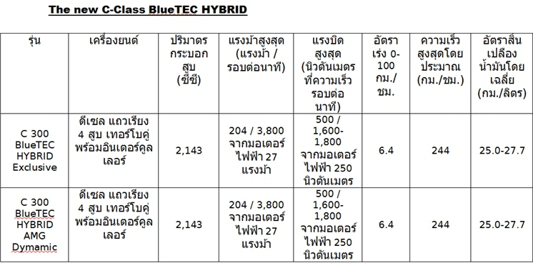 มาร์ทิน ชูลซ์ รองประธานบริหารฝ่ายขายและการตลาด บริษัท เมอร์เซเดส-เบนซ์ (ประเทศไทย) จำกัด กล่าวว่า “The new C-Class BlueTEC HYBRID นับเป็นยนตรกรรมในตระกูล C-Class ที่เข้ามาเติมเต็มพอร์ทโฟลิโอของรถยนต์ดีเซลไฮบริดในกลุ่ม Contemporary Luxury ให้ครบครันมากยิ่งขึ้น โดยรถยนต์ทั้ง 2 รุ่น คือ C 300 BlueTEC HYBRID Exclusive และ C 300 BlueTEC HYBRID AMG Dynamic มาพร้อมกับ เทคโนโลยี HYBRID การทำงานอย่างยอดเยี่ยมของระบบควบคุมพลังงาน ซึ่งทำหน้าที่ในการผสานการทำงานระหว่างเครื่องยนต์ดีเซลแบบ 4 สูบกับมอเตอร์ไฟฟ้า และระบบเกียร์ให้เป็นไปโดยอัตโนมัติ ทำให้เกิดประสิทธิภาพสูงสุดในการประหยัดเชื้อเพลิงและลดมลพิษทุกครั้งที่ชะลอความเร็วหรือเบรก มอเตอร์ไฟฟ้าจะทำหน้าที่เป็นเจนเนอเรเตอร์แปลงพลังงานจลน์ที่เหลืออยู่ในระบบขับเคลื่อนให้กลายเป็นพลังงานไฟฟ้าสะสมไว้ในแบตเตอรี่ลิเธี่ยม-ไอออน เพื่อเก็บสำรองไว้และนำกลับมาใช้ใหม่อีกครั้ง ซึ่งรถยนต์รุ่นนี้ยังได้ผ่านมาตรฐานความสิ้นเปลืองน้ำมันเชื้อเพลิงและปริมาณไอเสีย (Euro 6) ที่เข้มงวดอีกด้วย”