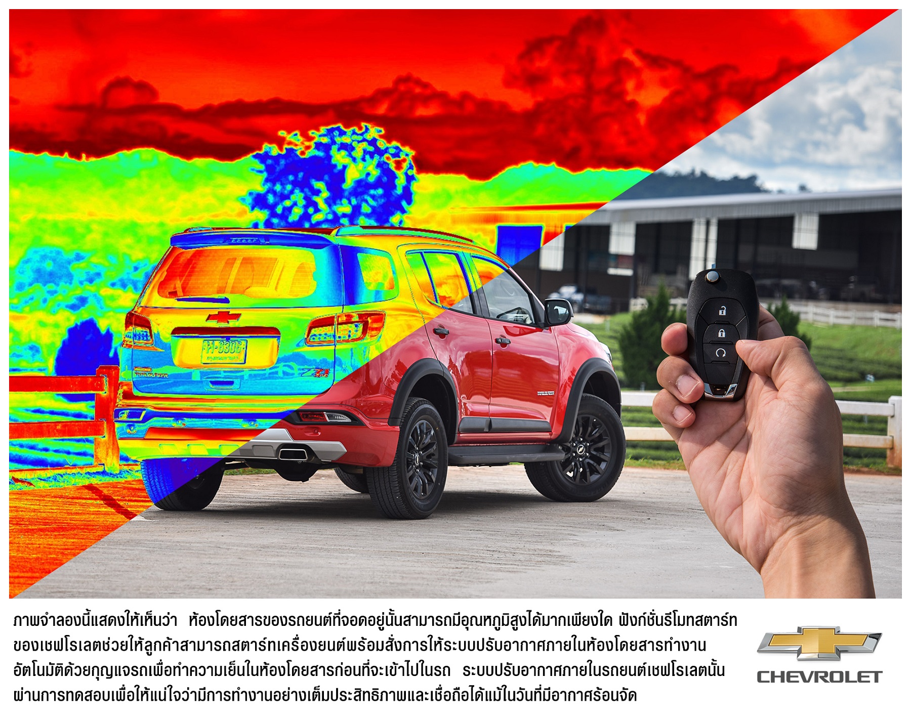![]() หากผู้ขับขี่ต้องการจอดแวะทำธุระระหว่างทาง ผู้ขับขี่สามารถใช้ฟังก์ชั่นรีโมทสตาร์ทที่มีในเทรลเบลเซอร์และโคโลราโดเพื่อความปลอดภัยและความเย็นสบายของผู้โดยสารท่านอื่นที่ยังอยู่ภายในรถยนต์ โดยทำการดับเครื่องยนต์ แล้วนำกุญแจออกมาด้านนอก ล็อกประตูรถยนต์และใช้ฟังก์ชั่นรีโมทสตาร์ทเพื่อสตาร์ทเครื่องยนต์พร้อมสั่งการให้ระบบปรับอากาศภายในห้องโดยสารทำงานอัตโนมัติ ลูกค้าเชฟโรเลตจะได้รับความเย็นฉ่ำและความสะดวกสบายแม้แต่ในวันที่มีอากาศร้อนจัด เนื่องจากวิศวกรฝ่ายพัฒนาผลิตภัณฑ์ระดับโลกของเจนเนอรัล มอเตอร์ส ทำการทดสอบระบบปรับอากาศท่ามกลางอุณหภูมิภายนอกที่สูงถึง 46 องศาเซลเซียส เพื่อสร้างความมั่นใจว่าระบบปรับอากาศในรถยนต์ของจีเอ็มนั้นทำงานอย่างเต็มประสิทธิภาพ การทดสอบอุณหภูมิของระบบปรับอากาศโดยทั่วไปจะต้องมีการขับขี่ทดสอบเป็นระยะทางหลายพันกิโลเมตรทั้งในสภาวะการใช้งานจริงและในสภาพแวดล้อมจำลอง วิศวกรทำการทดสอบที่สนามทดสอบกลางทะเลทรายของจีเอ็มในเมืองยูมา รัฐแอริโซน่า สหรัฐอเมริกา ซึ่งสภาพอากาศใน ฤดูร้อนของที่นั่นสูงถึง 42 องศาเซลเซียส และยังทำการทดสอบภายในห้องปฏิบัติการทดสอบสภาพอากาศของจีเอ็มที่มีอุณหภูมิสูงยิ่งกว่า การทดสอบในสภาวะการใช้งานจริงและในสภาพแวดล้อมจำลองนั้น รถยนต์ที่ได้รับการทดสอบจะผ่านกระบวนการ “สะสมความร้อนจากแสงอาทิตย์ (solar load) ” อย่างเต็มที่เพื่อทำให้รถยนต์ได้รับความร้อนจากการตากแดดมากที่สุด หลังจากนั้นวิศวกรของจีเอ็มจะขับรถยนต์คันดังกล่าวด้วยความเร็วคงที่เพื่อสร้างความมั่นใจว่าระบบปรับอากาศนั้นสามารถทำความเย็นภายในห้องโดยสารให้มีอุณหภูมิที่อยู่ในระดับเย็นสบายภายในเวลาไม่กี่นาที “รถยนต์เชฟโรเลตได้ผ่านการทดสอบระบบปรับอากาศท่ามกลางอุณหภูมิสูง ทำให้เรามั่นใจว่า ในพื้นที่ที่มีอากาศร้อนอย่างประเทศไทย ลูกค้ารถกระบะโคโลราโดและรถอเนกประสงค์เทรลเบลเซอร์ จะมีระบบปรับอากาศที่มีประสิทธิภาพและเชื่อถือได้ทุกครั้งที่เปิดใช้งาน” นายชัชวาล จันทเขต ผู้อำนวยการทั่วไปฝ่ายวิศวกรรมผลิตภัณฑ์ จีเอ็ม เอเชียตะวันออกเฉียงใต้กล่าว ผู้เชี่ยวชาญระบุว่า รถยนต์ที่มีตัวถังและภายในห้องโดยสารโทนสีอ่อนจะมีอุณหภูมิลดลงรวดเร็วกว่ารถยนต์ที่มีสีเข้ม เนื่องจากสีเข้มดูดซับความร้อนจากแสงอาทิตย์ได้มากกว่าสีอ่อน ดังนั้น รถยนต์สีอ่อนจึงมีอุณหภูมิต่ำกว่ารถยนต์สีเข้มประมาณ 5 องศาเซลเซียสเมื่อถูกนำไปทดสอบการสะสมความร้อนพร้อมกัน นอกจากนี้ ฟิล์มกรองแสงติดรถยนต