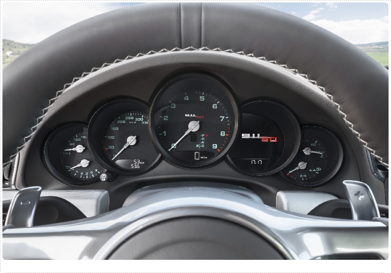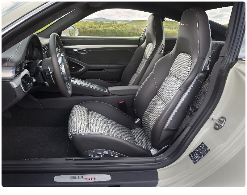 ไม่เพียงเท่านี้ ภายในห้องโดยสารของ 911 รุ่นพิเศษคันนี้ยังสะท้อนให้เห็นถึงความดั้งเดิมของ 911 ออกมาด้วยเช่นกัน โดยหน้าปัดรถจะมีตัวหนังสือสีเขียว เข็มหน้าปัดจะเป็นสีขาว และรอบวงหน้าปัดจะเป็นสีเงิน เหมือนกับ 50 ปีก่อน อีกหนึ่งคุณลักษณะเด่นคือแผงที่นั่งตรงกลางของเบาะหนังนั้นได้รับการออกแบบให้ชวนนึกถึงการออกแบบของ “Pepita” tartan design ในช่วงทศวรรษ 1960s อีกด้วย หนังภายในห้องโดยสารได้รับการออกแบบให้ออกมาในรูปแบบสีเทา Agate grey หรือสีดำ มาพร้อมกับสีลายตะเข็บที่ตัดกันเพิ่มความโดดเด่น เบาะนั่งสำหรับผู้ขับขี่และผู้โดยสารด้านหน้าออกมาในรูปแบบเบาะสปอร์ตปรับเปลี่ยนแบบไฟฟ้าได้ 14 ทิศทาง หรือเลือกติดตั้งเบาะสปอร์ต พลัส แบบปรับเปลี่ยนโดยไฟฟ้าได้ 18 ทิศทางได้ คันเกียร์และกล่องเกียร์ได้รับการออกแบบให้เข้ากับแผงหน้าปัดได้อย่างลงตัว ประตูและคอนโซลกลางมาพร้อมกับแถบอลูมิเนียมด้าน (Brushed aluminium) ซึ่งเป็นการออกแบบมาเป็นพิเศษโดยโปรแกรมการตกแต่งของ Porsche Exclusive นั่นเอง