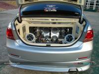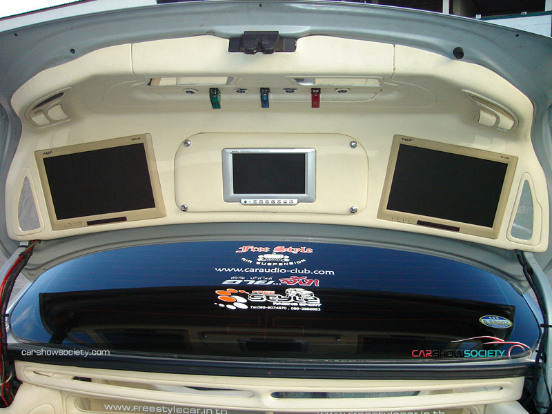 และสุดท้ายในส่วนของเครื่องเสียงคันนี้ก็ไม่น้อยหน้าใครเช่นกัน เพราะแค่เปิดฝากระโปรงท้ายเท่านั้นก็จะเห็นถึงการติดตั้งชุดเครื่องเสียงแบบเต็มรูปแบบ ซึ่งจะเล่นตีตู้ในแบบอะคีลิกใส เพื่อโชว์ให้เห็นลำโพงซับวูฟเฟอร์ดอกใหญ่ขนาดประมาณ 18 นิ้ว จำนวน 1 คู่ และลำโพงแยกชิ้นกลางแหลมอีกหลายตัว ที่สำคัญเน้นเอนเตอร์เทนอย่างเต็มที่ด้วยการติดตั้งทีวีที่ภายในฝากระโปรงหลัง โดยมีถึง 3 ตัวขนาบข้างด้วยจอใหญ่ของซูเล็กซ์จำนวน  2 ตัว และตรงกลางเป็นจอขนาดเล็ก