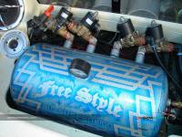 และในส่วนของถังลม ซึ่งได้ติดตั้งไว้ด้านท้ายที่ห้องเก็บสัมภาระได้ทำพ่นสีสันเป็นสีฟ้าเล่นแอร์บรัชลวดลายเป็นเส้นด้วยสีบรอนด์ กับยี่ห้อ FREE STYLE    สำหรับระบบถุงลมนั้น เท่าที่ดูก็แทบจะไม่แตกต่างไปจากระบบไฮดรอลิกมากนัก   เพราะจะต้องมีชุดสวิทช์ควบคุม เพื่อใช้ในการปรับระดับของตัวรถให้สูงต่ำได้ตามชอบใจ   แต่ที่เหนือกว่าก็ตรงที่ระบบถุงลมสามารถใช้งานได้ทนทานกว่า เพราะที่สำนักแต่งฟรีสไตล์เขากล้ารับประกันตลอดอายุการใช้งาน