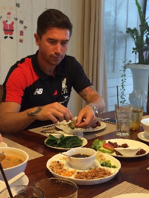 หลังจากที่ แฮรี่ คีเวลล์ อดีตแข้ง ลิเวอร์พูล ชาวออสเตรเลีย ได้บินลัดฟ้าเดินทางมาร่วมงานแถลงข่าวฟุตบอลนัดพิเศษ ระหว่าง ลิเวอร์พูล และ ทรู ออลสตาร์ ที่ลาน เซ็นทรัล คอร์ต ศูนย์การค้าเซ็นทรัลเวิลด์ เมื่อวันที่ 30 มิถุนายน ที่ผ่านมา พร้อมได้พบปะแฟนบอลบางส่วนที่มาขอสัมผัสอดีตแข้ง “หงส์แดง” ตัวจริงเสียงจริงแบบใกล้ชิดแล้ว ล่าสุด วันที่ 1 กรกฏาคม ที่ผ่านมา คีเวลล์ พร้อมทีมงานของ ทรู คอร์เปอเรชั่นส์ ได้ออกเดินสายโปรโมตกิจกรรมฟุตบอลนัดประวัติศาสตร์ตามสถานีโทรทัศน์ต่างๆของไทย ตั้งแต่ช่วงเช้า ก่อนแวะรับประทานอาหารที่ร้าน ทีแอนด์ที ประชาชื่น ซึ่ง คีเวลล์ ได้ถือโอกาสลิ้มลองอาหารไทยในหลายเมนู ซึ่งเจ้าตัวก็สามารถรับประทานได้หลายอย่าง โดยเฉพาะอาหารที่มีรสชาดเผ็ด อย่าง แกงเขียวหวาน ต้มยำกุ้ง อาหารไทยขวัญใจชาวต่างชาติ นอกจากนี้ คีเวลล์ ยังโปรดปรานเมนู "เมี่ยงคำ" เป็นพิเศษ โดยระบุว่าเป็นอาหารไทยที่รสชาดยอดเยี่ยมที่สุดเท่าที่ตัวเองเคยทานมา ก่อนติดใจจนต้องขอสั่งเพิ่มอีกในภายหลัง |
