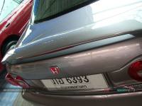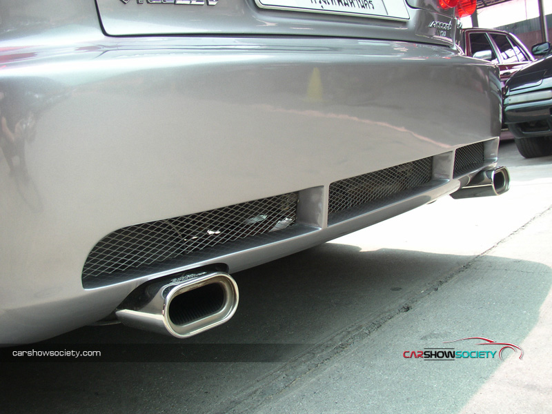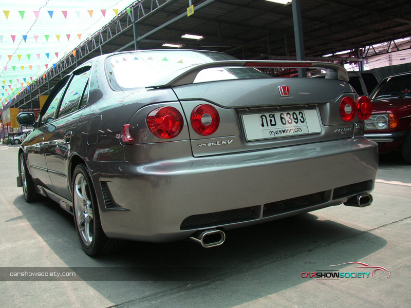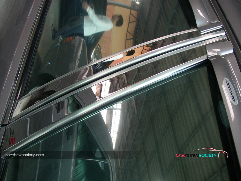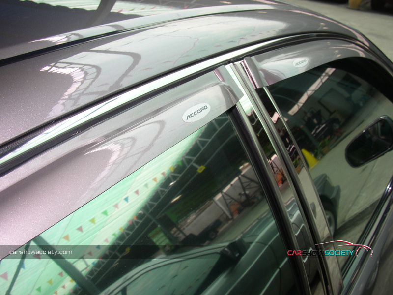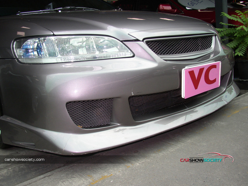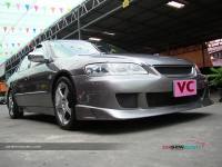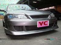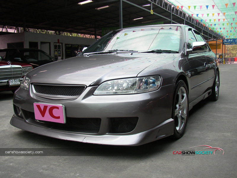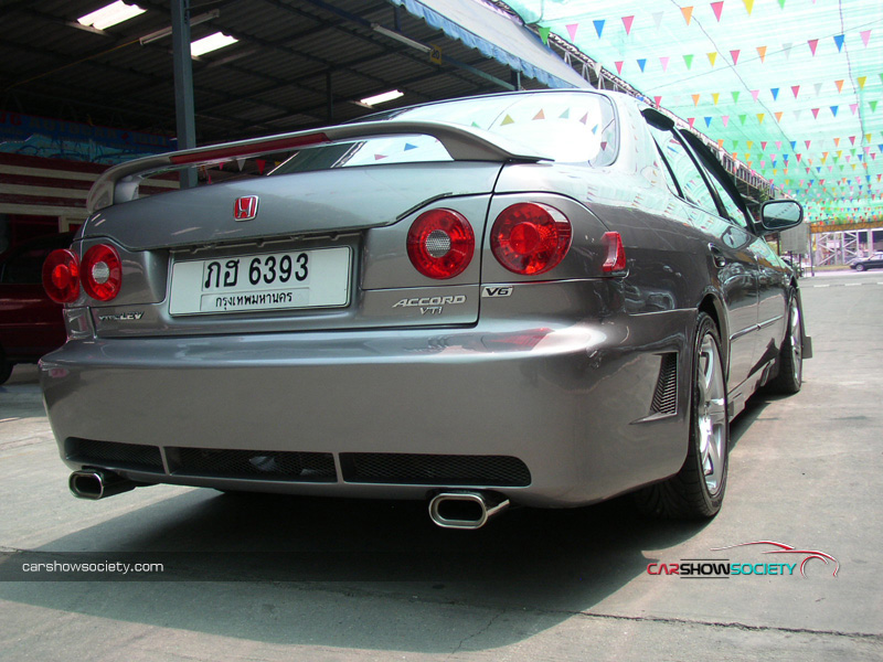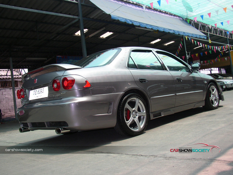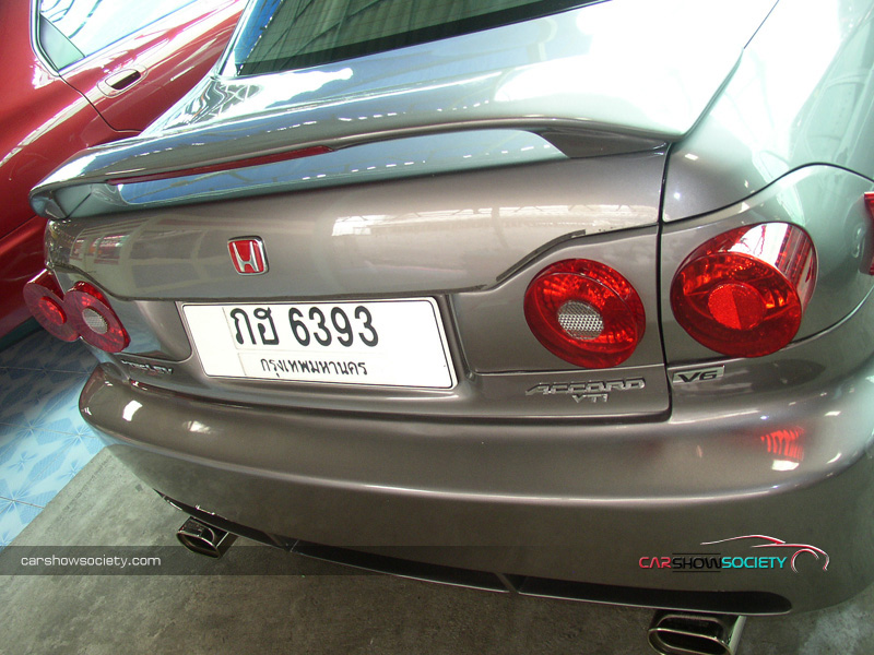 แต่ถ้ายังนึกภาพไม่ออกก็ลองดูรถที่นำมาโชว์กัน ซึ่งเป็น HONDA ACCORD V6 ปี 2001 ที่รูปลักษณ์ภายนอกสามารถให้ความภูมิฐานได้ระดับหนึ่ง แต่คันนี้ได้เพิ่มความเร้าใจด้วยตกแต่งบอดี้พาร์ท ที่ดีไซน์ทั้งกันชนหน้า-หลังและสเกิร์ตข้างให้มีความเป็นสปอร์ตมากขึ้น ควบคู่ไปกับอุปกรณ์แต่งอื่น ๆ ที่เพิ่มให้มีความเท่มากขึ้นโดยเฉพาะไฟท้าย ส่วนภายในนั้นให้ความรู้สึกถึงความกว้างขวาง หรูหรา ที่สามารถสัมผัสได้ พร้อมกับการแต่งหน้าปัดขาวที่สามารถปรับแสงตามต้องการ ในการปรับแต่งของแอคคอร์ดตัว V6 นี้ สำหรับคันนี้ขอเน้นที่ความเท่อย่างเดียว โดยเล่นสวมบอดี้พาร์ทที่สั่งดีไซน์เอง เริ่มจากด้านหน้าที่ต้องถอดกันชนเดิมออกแล้วเปลี่ยนใส่กันชนทรงใหม่ที่มีขนาดใหญ่แบบมีลิ้นหน้าในตัว โดยออกแบบให้ช่องดักลมตรงกลางและช่องด้านข้างออกมาในสไตล์โค้งมน ทำให้ดุดันไม่เบา ในขณะที่กระจังหน้าเป็นของ MUGEN แบบรังผึ้ง ที่ดูเข้าท่าสอดรับกันดี แถมติดโลโก้แต่งสีแดงของฮอนด้า และเหนือกระจังหน้ายังมีแผ่นปิดที่ฝากระโปรงหน้าด้วย ส่วนไฟหน้าเป็นแบบชิ้นเดียวแต่ได้ปรับเปลี่ยนมาเป็นหลอดไฟแบบซีนอนที่ให้แสงสว่างสีขาวมองเห็นชัดเจนยิ่งขึ้นและป้ายทะเบียนแต่งให้เป็นแบบยาว ส่วนใบปัดน้ำฝนหันมาชุบโครเมียมให้สวยขึ้น พร้อมกับติดฝาครอบโครเมียมที่ฉีดน้ำล้างกระจกหน้า สำหรับด้านข้างแต่งล้อแม็กขอบ 17 นิ้ว ซึ่งเป็นผลิตภัณฑ์ของ AUTOMOBLE DESIGN ในแบบ 5 ก้านคู่กับยางคุณภาพจาก YOKOHAMA รุ่น ADVAN ขนาด 215/45R17 และยังได้เปลี่ยนไฟเลี้ยวแก้มข้างเป็นฝาขาวแบบคริสตัล พร้อมกรอบไฟในแบบมีปีก ถัดขึ้นมากระจกส่องข้างที่อาศัยฝาครอบโครเมียมมาปิดทับเข้าไป เพื่อให้ดูเงางามยิ่งขึ้น และไม่ห่างกันที่ขอบประตูได้แปะด้วยเวทเธอร์การ์ดทั้ง 4 อันตามสไตล์เรซิ่ง ซึ่งเป็นของแต่งเฉพาะรุ่นแอคคอร์ดในแบบสีเดียวกับตัวรถ หรือแม้แต่เสาประตูก็ยังติดแผ่นโครเมียมของ TYPE R ไว้ให้ดูเล่น รวมไปถึงครอบมือประตูก็เป็นของแต่งที่ให้ความสวยงามเช่นกันส่วนสเกิร์ตข้างได้แนบติดที่ชายล่างได้อย่างลงตัว ด้วยการดีไซน์ให้มีช่องที่ปลายสเกิร์ตเพื่อดักลมให้สามารถเป่าเบรกหลังได้ด้วย ทางด้านหลังของรถโดดเด่นด้วยไฟท้ายสเปกอเมริกา ซึ่งมาในแบบไฟกลมสไตล์โดนัทแบบ 2 ดวงที่นูนยื่นออกมา คล้ายกับไฟท้ายของรถสปอร์ตนิสสัน สกายไลน์ พร้อมติดมากับฝาครอบในตัวที่มาพ่นเป็นสีเดียวกับตัวรถเลยดูกลมกลืน (เดิมเป็นโครเมียม) และที่ด้านข้างฝาครอบยังมีแผงทับทิมทรงสามเหลี่ยมแนบติดอยู่ด้วย นอกจากนี้ได้ติดสปอยเลอร์ฝากระโปรงหลังเพิ่มอีกชิ้น ซึ่ง