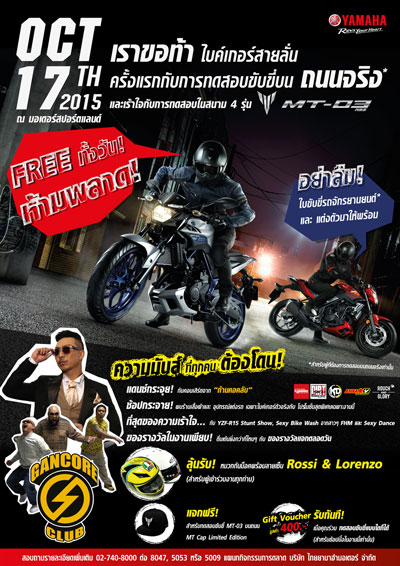 ยามาฮ่า ท้าพิสูจน์ความแรง MT-03 ครั้งแรกของการทดสอบขับขี่บนถนนจริง ในวันที่ 17 ต.ค. นี้ ที่มอเตอร์สปอร์ตแลนด์ บริษัท ไทยยามาฮ่ามอเตอร์ จำกัด ผู้ผลิต และจำหน่ายรถจักรยานยนต์ชั้นนำของเมืองไทย ขอเชิญไบค์เกอร์ที่ชื่นชอบความแรง ร่วมกิจกรรมทดสอบการขับขี่รถจักรยานยนต์ยามาฮ่า MT-03 ซึ่งเป็นครั้งแรกของการพิสูจน์สมรรถนะการขับขี่บนถนนจริง พร้อมสัมผัสประสบการณ์เร้าใจกับการทดสอบรถจักรยานยนต์ยามาฮ่าในสนามอีก 4 รุ่น ได้แก่ MT-03, NMAX, YZF-R3 และ YZF-R15 โดยไม่เสียค่าใช้จ่าย ในวันเสาร์ที่ 17 ตุลาคม 2558 ณ มอเตอร์สปอร์ตแลนด์ (แดนเนรมิต) ตั้งแต่เวลา 09.00 - 19.00 น.