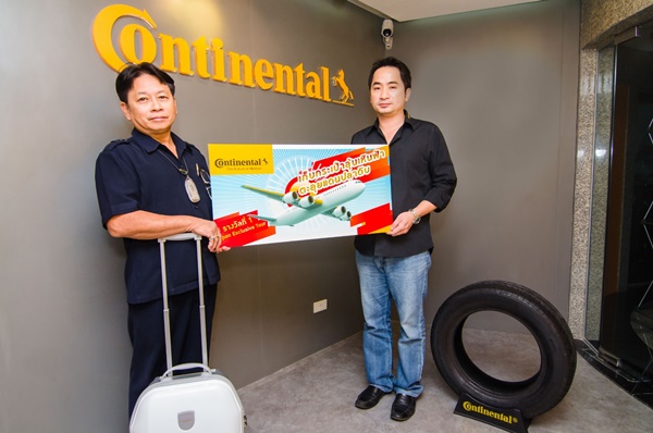 ยางคอนติเนนทอล มอบรางวัลแก่ลูกค้าผู้โชคดี พาตะลุยแดนปลาดิบนายพีระ พัฒนางกูร (ขวา) ผู้อำนวยการฝ่ายขายยางรถยนต์และรถขับเคลื่อนสี่ล้อ บริษัท คอนติเนนทอล ไทร์ส (ประเทศไทย) จำกัด มอบรางวัลที่ 1 “Japan Exclusive Tour” มูลค่า 170,000 จากแคมเปญโปรโมชั่นพิเศษ “เก็บกระเป๋าลุ้นเหินฟ้า ตะลุยแดนปลาดิบกับคอนติเนนทอล” ให้กับนายสุรัตน์ ภู่ไพโรจน์ (ซ้าย) ที่เดินทางมารับรางวัลก่อนมุ่งหน้าไปโตเกียวในวันเดียวกัน โดยยางรถยนต์คอนติเนนทอลจัดแคมเปญนี้ขึ้นในช่วงหน้าฝนเพื่อชวนลูกค้าที่ซื้อยางคอนติเนนทอล 4 เส้น ร่วมลุ้นรางวัลมูลค่ารวมกว่า 6 แสนบาท