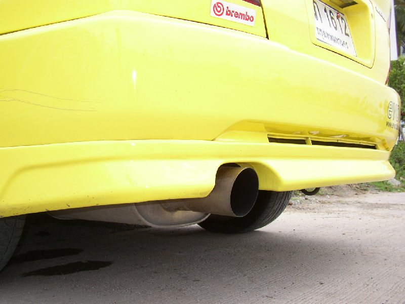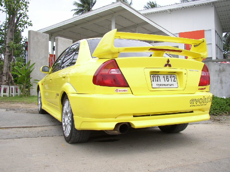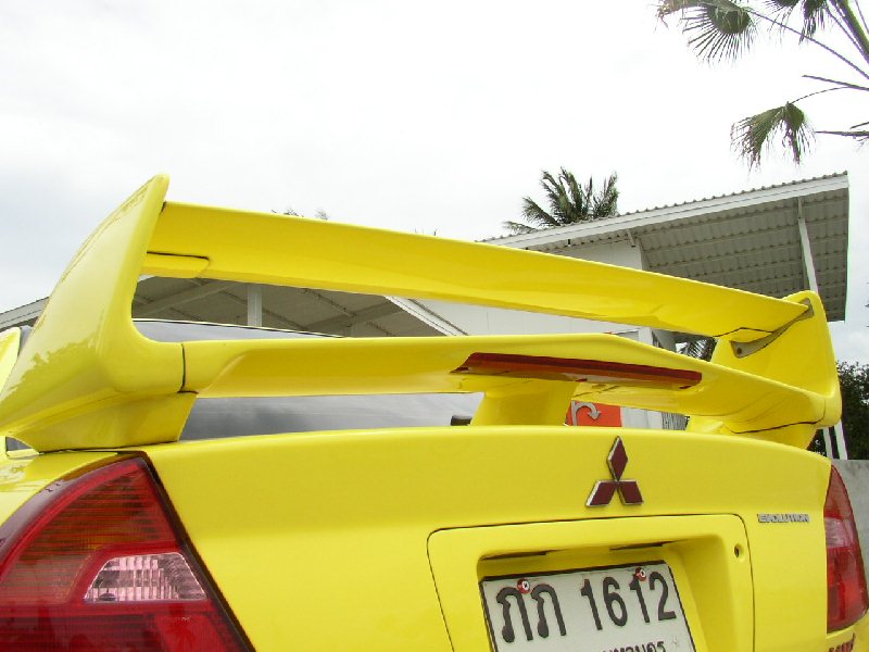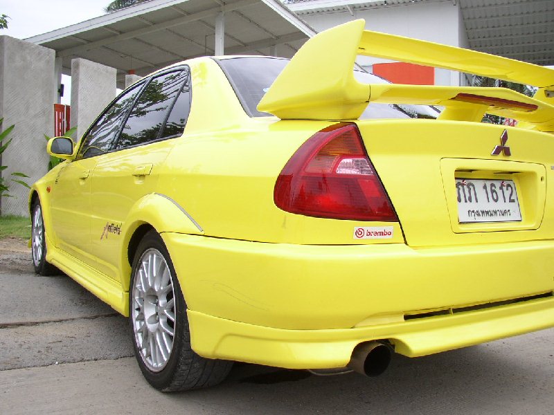 ส่วนหางหลังนั้นจะเป็นทรงสูงในแบบ  EVO  VI  ที่มีทั้งปีกล่างและปีกบน  โดยตัวปีกล่างจะเป็นทรงสามเหลี่ยมมีไฟเบรคดวงที่สามฝังอยู่ แต่สำหรับปีกบนนั้นสามารถปรับระดับได้ ซึ่งจะช่วยตอบสนองในเรื่องของการกดอากาศให้เวลาที่ใช้ความเร็วสูง    และที่กระจกหลังยังเป็นแบบไล่ฝ้าและมีสัญญาณวิทยุ รวมไปถึงมีที่ปัดน้ำฝนมาให้เสร็จสรรพ   ตลอดจนยังได้ติดสติกเกอร์จากญี่ปุ่นที่เป็นการการันตีเกี่ยวกับมลภาวะเป็นพิษ  ซึ่งได้ติดทั้งแบบ 3 ดาวและ 4 ดาว แถมด้วยสติกเกอร์จอดรถ ที่เวลานี้หายากและกำลังนิยมติดกันอยู่ เช่นเดียวกับปลายท่อที่เป็นของแต่งคู่บารมีจาก RALLIART