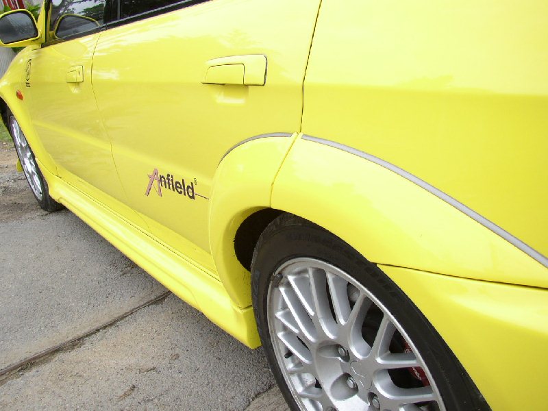 ถัดมาดูที่กระจกส่องข้างกับกระจกรอบคัน   หรือแม้แต่ประตูหน้า-หลังก็ต้องใช้ของแท้  EVO  VI โดยที่ประตูจะมีขอบสันเป็นเส้น   และที่ขอบล้อหลังยังได้เสริมขอบยื่นออกมาเพื่อเป็นที่ยึดของโปร่งหลัง ซึ่งจะต้องเชื่อมรับกับกันชนหลังได้อย่างพอดี  โดยที่ล้อแม็กนั้นเป็นของ  EVO VII ที่มีลายก้านแบบตัว Y มีขนาดขอบ  17  นิ้วกว้าง  8 นิ้วและรัดด้วยยาง BRIDSTON POTENZA RE01 ขนาด 235/45ZR17 และเมื่อผ่านมาถึงกันชนหลังทรงอวบใหญ่ไม่ไกลกันจะเห็นฝากระโปรงหลังและไฟท้ายที่ไปจับเอาของ F-STYLE  ซึ่งเป็นรุ่นสุดท้ายของท้ายเบนซ์ และออกมาขายไม่กี่เดือนก็เปลี่ยนเป็นซีเดีย ซึ่งที่ตัวไฟท้ายจะมีการหักมุมพร้อมกับไฟถอยหลังแบบตาเพชรขาวอมชมพู คู่กับไฟเลี้ยวเหลืองคาดเส้นแดง