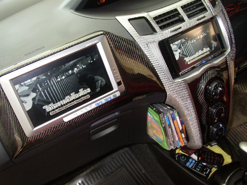 ภายในห้องโดยสารได้ตกแต่งไม่น้อยกว่าภายนอก โดยเฉพาะแผงสวิตช์แอร์ที่หุ้มด้วยเคฟลาร์สีบรอนซ์ตัดด้วยขอบด้านนอกที่เป็นเคฟลาร์สีดำ และได้ออกแบบเบ้าครอบจอมอนิเตอร์ขึ้นมาใหม่ในแบบเคฟลาร์ที่บริเวณคอนโซลฝั่งซ้าย ส่วนด้านบนคอนโซลหน้าได้วางเกจวัดไว้เพียบเป็นของ DEFI  เพื่อไว้วัด OLI PRESS, FUEL PRESS, OIL TEMP., TER TEMP. และ EXT TEMP.ส่วนเบาะนั่งได้ขยับมาเป็นของ RECARO ในแบบสีแดง และที่แผงประตูได้ปรับแต่งเป็นแผงแบบเคฟลาร์ทั้งประตูหน้า-หลัง แถมด้วยครอบบันไดสเตนเลสของยาริส