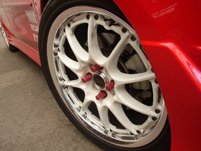 ส่วนด้านข้าง แน่นอนว่าจะต้องปรับเปลี่ยนล้อแม็กใหม่เป็นขอบ 17 นิ้ว ซึ่งเป็นของ VOLK RACING ผลิตภัณฑ์จาก RAYS  ENGINEERING ซึ่งเป็นที่ยอมรับในหมู่นักซิ่งว่ามีคุณภาพคุ้มกับราคาที่แพง  เพราะใช้วัสดุที่มีน้ำหนักเบา และยังดีไซน์ได้โดนใจในสไตล์ก้านแม็กสีขาว 10 ก้าน ที่ตัดกับขอบล้อโครเมียม  พร้อมนอตล้ออะลูมิเนียมแบบยาวสีแดงจาก RAYS ที่มีระบบป้องกันขโมย โดยจะมีนอตหนึ่งในสี่ตัวที่จะต้องใช้บล็อกขันแบบพิเศษที่แถมมาให้เท่านั้น ส่วนยางนอกเป็นของ YOKOHAMA รุ่น DNA bB ขนาด 205/45ZR 17