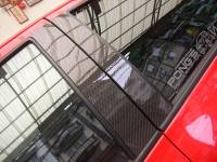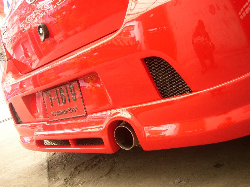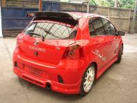 และที่ขอบชายล่างด้านข้างยังได้แนบด้วยสเกิร์ตของ C-ONE ที่มีลูกเล่นทำเป็นครีบที่ปลายสเกิร์ต สำหรับกันชนหลังเป็นของ C-ONE ที่สามารถสวมเข้ากับตัวลงได้อย่างกลมกลืน แต่มีดีไซน์ให้เข้าตาอยู่พอตัว ด้วยการเจาะด้านข้างระหว่างป้ายทะเบียน และยังมีช่องโผล่ของหม้อพักใบปลายของ C-ONE ขณะที่ไฟท้ายได้สลับมาเป็นของ VITZ พร้อมกับโลโก้กลมของ VITZ คู่กับอักษร VITZ ไว้ที่ฝากระโปรงหลังด้วย แต่ที่เด่นสุดเห็นจะเป็นสปอยเลอร์หลังคาที่สั่งทำใหม่เป็นแบบเคฟลาร์ในสไตล์ของ C-ONE