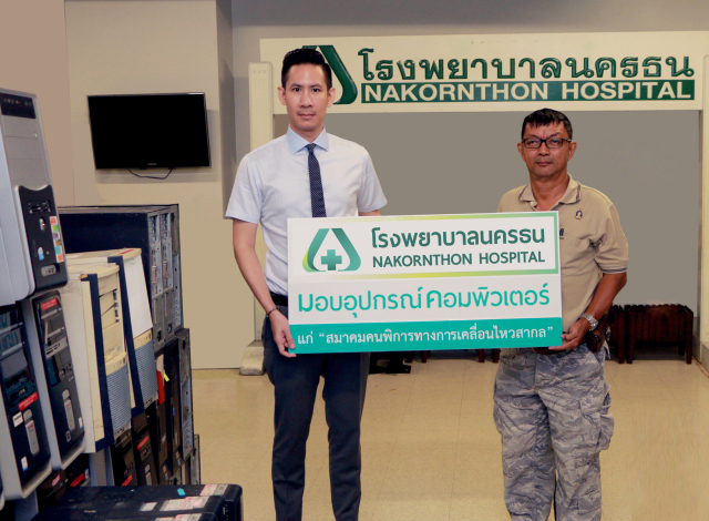 รพ.นครธน ปันน้ำใจมอบอุปกรณ์คอมฯ เพื่อผู้พิการทางการเคลื่อนไหวนายปิยะเดช ทองสิมา (ซ้าย) ผู้ช่วยผู้อำนวยการฝ่ายบริหาร โรงพยาบาลนครธน มอบอุปกรณ์คอมพิวเตอร์ที่ไม่ใช้งานแล้วแต่ยังมีสภาพที่ใช้งานได้ จำนวน 500 ชิ้น ให้แก่สมาคมคนพิการทางการเคลื่อนไหวสากล เพื่อนำไปจำหน่ายนำรายได้มาเป็นทุนในการจัดซื้อรถวีลแชร์ รถสามล้อโยก หรืออุปกรณ์อื่นๆ สำหรับผู้พิการในชนบทที่ขาดแคลน ซึ่งเป็นกิจกรรมที่โรงพยาบาลนครธนจัดขึ้นเพื่อช่วยเหลือสังคม ณ โรงพยาบาลนครธน เมื่อเร็วๆ นี้ |
