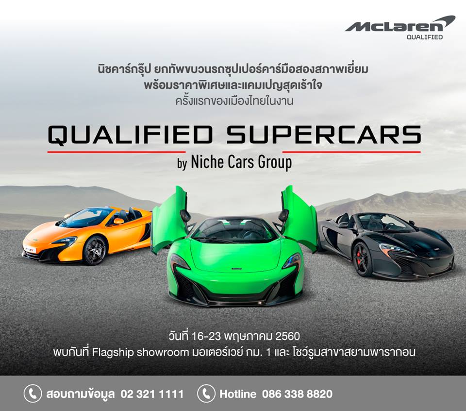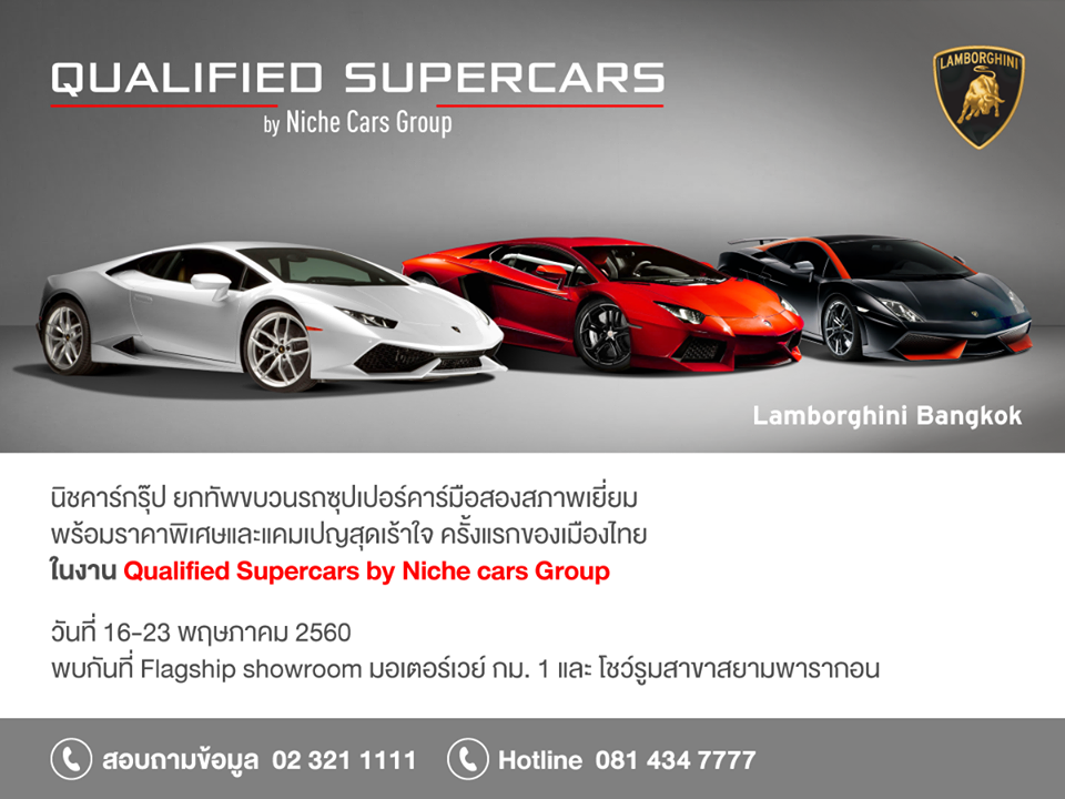 กรุงเทพฯ – บริษัท นิช คาร์ กรุ๊ป จำกัด ผู้นำเข้ารถยนต์ระดับซุปเปอร์คาร์ สปอร์ตคาร์ และไฮเปอร์คาร์ ในประเทศไทย และตัวแทนจำหน่ายแลมโบร์กินี และแมคลาเรนอย่างเป็นทางการ เพียงรายเดียวในประเทศไทยจัดงาน “Qualified Supercars by Niche Cars Group” ครั้งแรกที่ใหญ่ที่สุดของเมืองไทย ระหว่างวันที่ วันที่ 16 – 23 พฤษภาคม 2560 ณ โชว์รูมมอเตอร์เวย์ กม. 1 และ โชว์รูมสาขาสยามพารากอน โชว์รูมสาขามอเตอร์เวย์ กม. 1 พบกับขบวนรถซุปเปอร์คาร์มือสองสภาพเยี่ยม พร้อมราคาพิเศษและแคมเปญสุดเร้าใจ อาทิ แพ็คเกจบริการหลังการขายจากโรงงาน และวารันตีเพิ่มสูงสุดถึง2ปี เพื่อให้สาวกที่ชื่นชอบในรถซุปเปอร์คาร์เข้าเลือกชมและจับจองเป็นเจ้าของ ภายในงานได้รับเกียรติจากกูรูรถมือสอง คุณแมน ทัศไนย ไรวา และคุณภูมิ ภูมิใจ ตั้งสง่า ร่วมแชร์ประสบการณ์