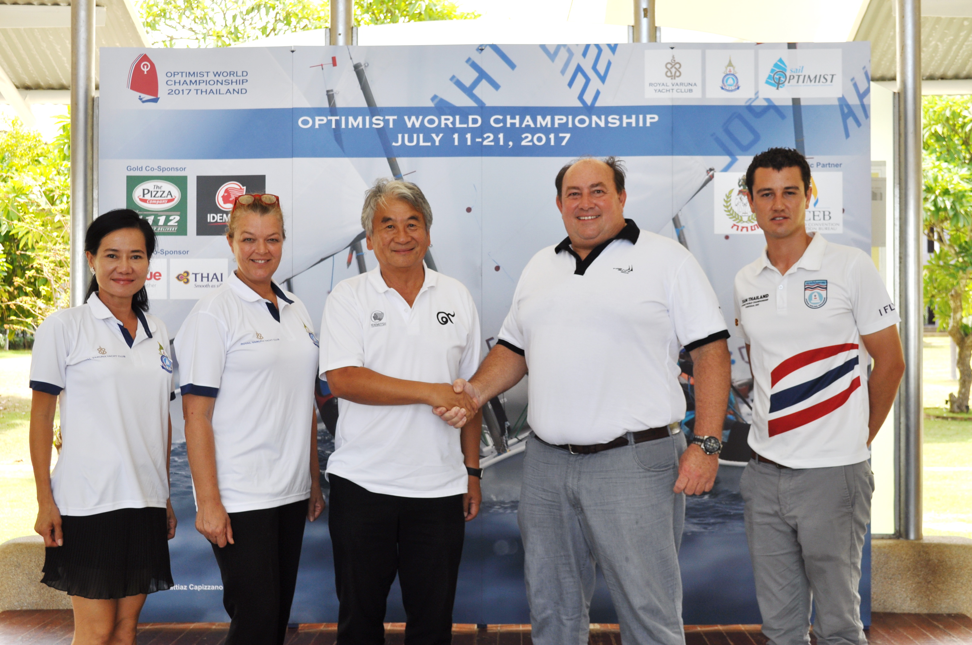 บรรยายภาพ: คณะกรรมการจัดงานแข่งขันเรือใบออพติมิสต์ชิงแชมป์โลก 2017 นำโดย มร. ธอมัส วิทคร๊าฟท์ (ที่ 2 จากขวา) ต้อนรับ ดร. จักรกริช วหาวิศาล (ที่ 3 จากขวา) ประธานกรรมการบริหาร บริษัท น้ำมันอพอลโล ประเทศไทย จำกัด ในโอกาสเข้าร่วมเป็นหนึ่งในผู้สนับสนุนของการแข่งขันเรือใบออพติมิสต์ชิงแชมป์โลก 2017