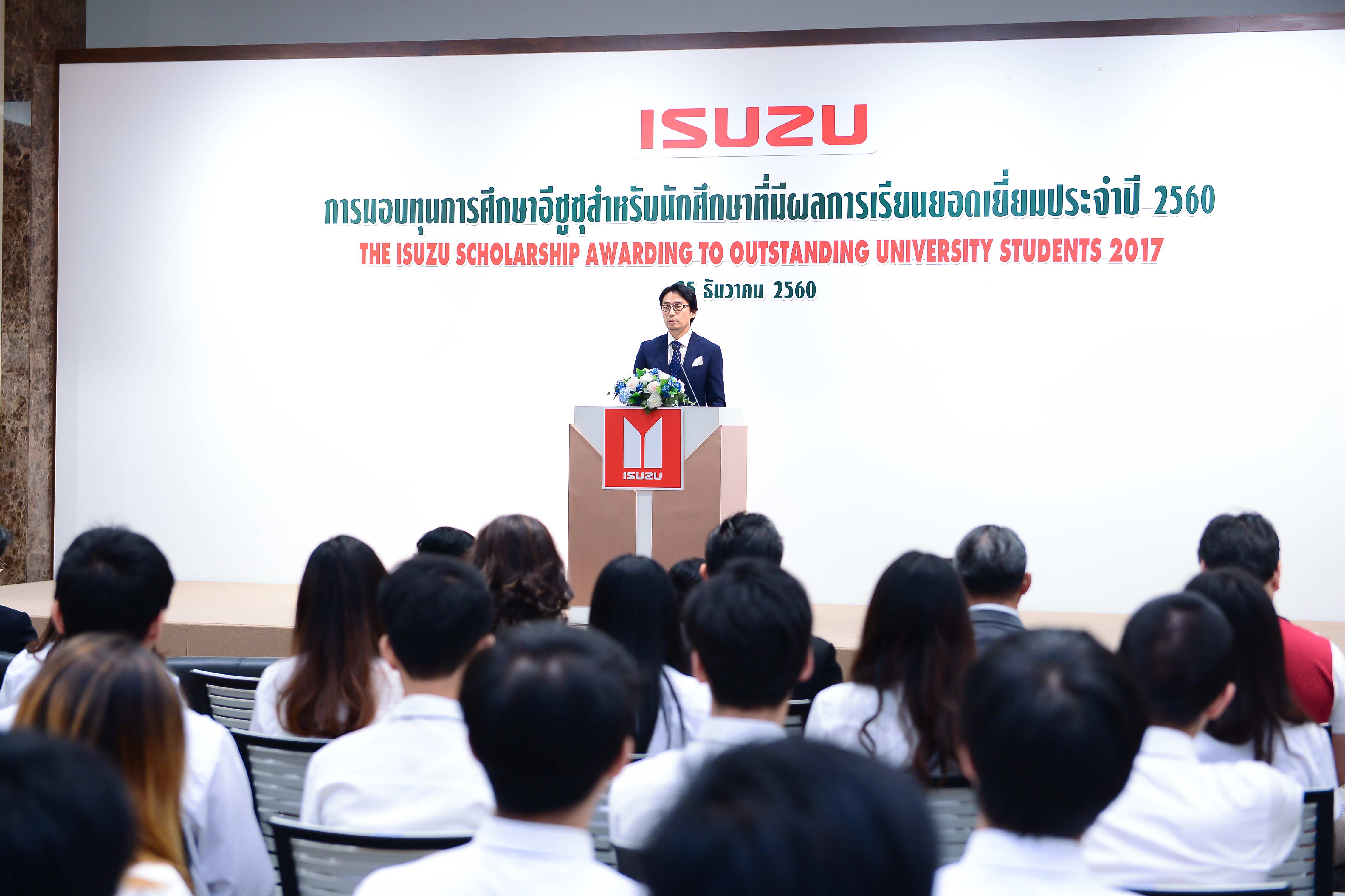 มร. โทชิอากิ มาเอคาวะ ประธานกรรมการมูลนิธิกลุ่มอีซูซุ และกรรมการผู้จัดการ บริษัท ตรีเพชรอีซูซุเซลส์ จำกัด กล่าวว่า “ตลอดระยะเวลา 60 ปี ของการดำเนินธุรกิจในประเทศไทย อีซูซุได้มุ่งเน้นการเสริมสร้าง และร่วมพัฒนาศักยภาพเยาวนชนไทยในด้านต่างๆ มาอย่างต่อเนื่อง ทั้งด้านวิชาการและสันทนาการอันเป็นประโยชน์ ในโอกาสนี้อีซูซุขอแสดงความยินดี แก่เยาวชนที่มีความเป็นเลิศทางการศึกษาเป็นเลิศทั้ง 58 ท่าน พร้อมขอมอบทุนการศึกษาพิเศษนี้ เพื่อเป็นการเชิดชูเกียรติ โดยหวังเป็นอย่างยิ่งว่านิสิตและนักศึกษาทุกคนจะสามารถบรรลุเป้าหมายเพื่อเติมโตเป็นพลังขับเคลื่อนประเทศไทยในอนาคตได้อย่างดียิ่ง”