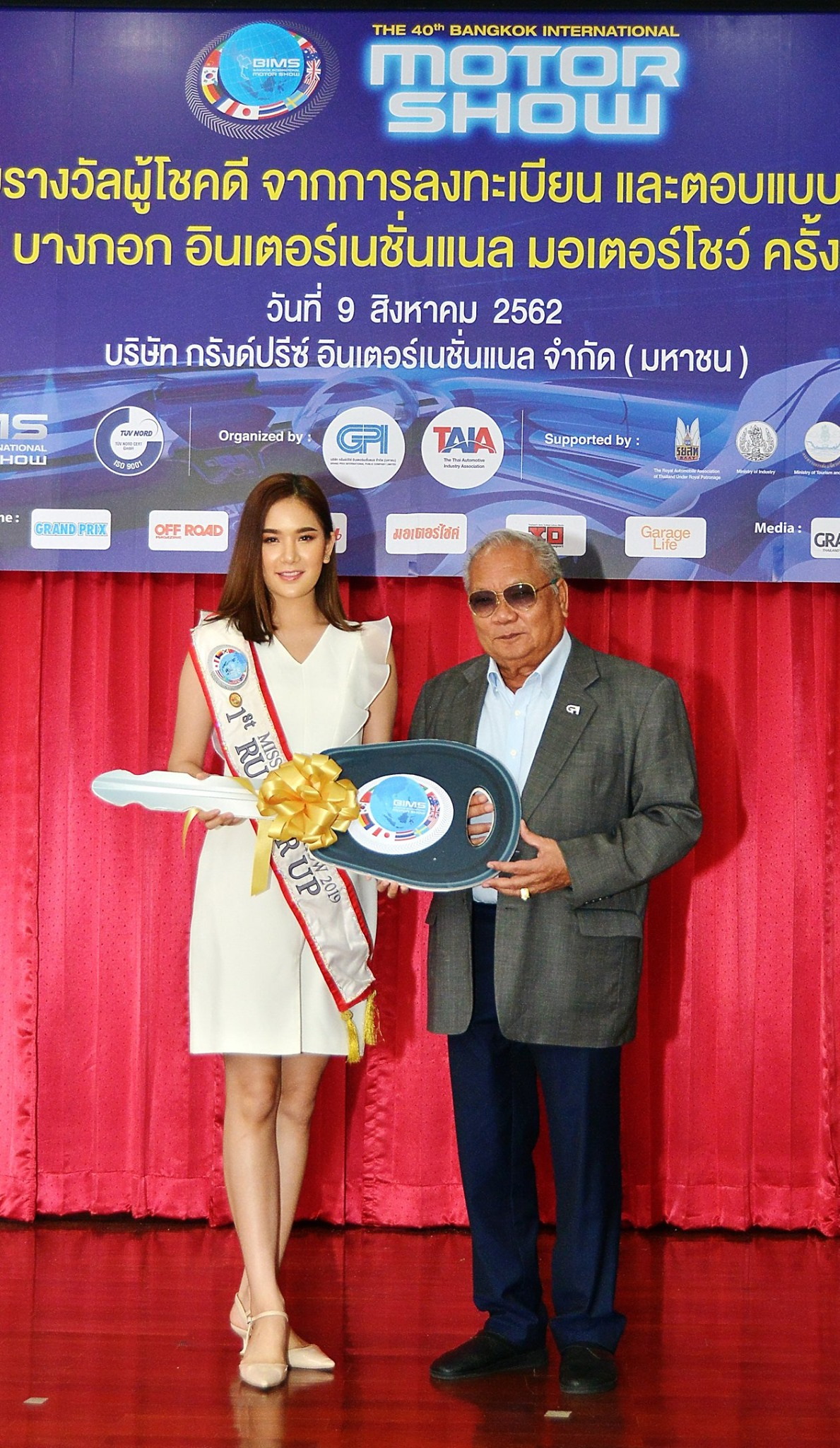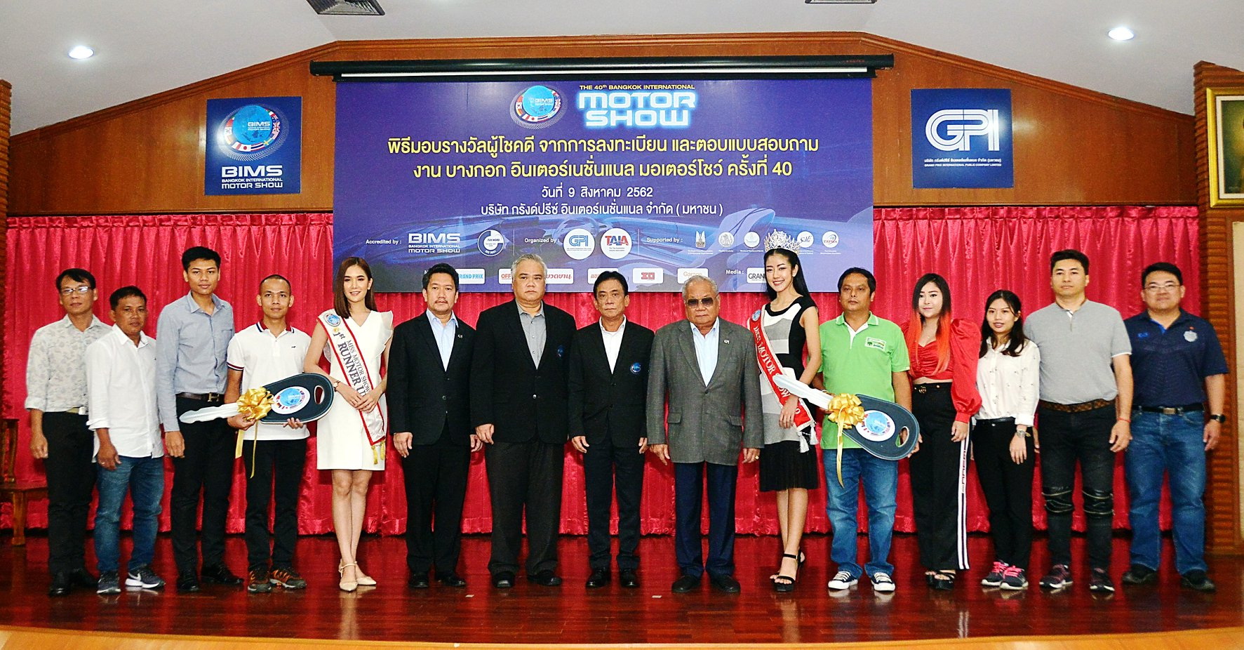 ในพิธีมอบรางวัล คณะผู้บริหาร นำโดย ดร.ปราจิน เอี่ยมลำเนา ประธานจัดงานฯ,คุณจาตุรนต์ โกมลมิศร์, คุณอโณทัย เอี่ยมลำเนา และคุณพีระพงศ์ เอี่ยมลำเนา รองประธานจัดงานฯ ร่วมกันให้การต้อนรับและขึ้นมอบรางวัลแก่ผู้โชคดีฯ มูลค่ารวมกว่า 3.46 ล้านบาท ก่อนปิดท้ายด้วยการส่งมอบรางวัลจากการประกวดมิสมอเตอร์โชว์ 2019 ได้แก่รถยนต์ Ford Ranger DBL 2.2 XLT Hi-Rider 6AT มูลค่า 879,000 บาทให้กับนางสาวณัฎฐ์ษา หุ่นแก้ว มิสมอเตอร์โชว์ 2019 และรถจักรยานยนต์ Yamaha Fino125 มูลค่า 46,000 บาท ให้กับนางสาวภัทราพร เกตุแก้ว รองอันดับ 1 พร้อมกันภายในงานฯ ณ ห้องประชุมใหญ่ อาคาร 2 ชั้น 4 บริษัท กรังด์ปรีซ์ อินเตอร์เนชั่นแนล จำกัด (มหาชน) เมื่อวันที่ 9 สิงหาคม 2562