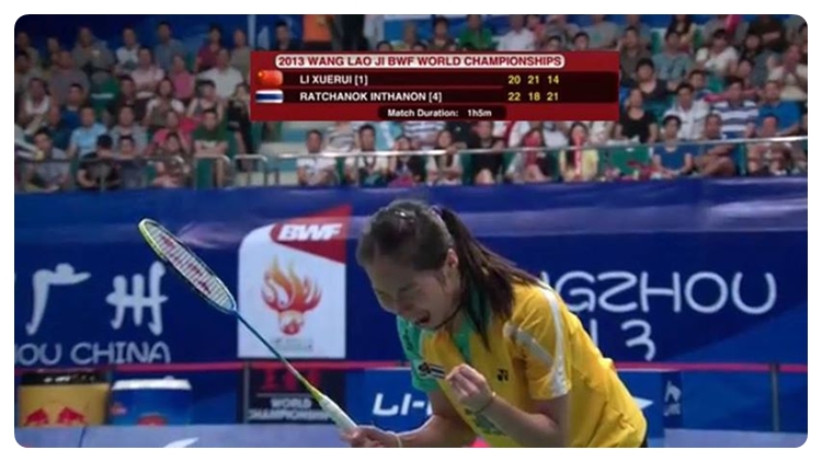 ถึงกับกลั้นน้ำตาแห่งความปลื้มปิติเอาไว้ไม่อยู่เลย สำหรับน้องเมย์ รัชนก อินทนนท์ หลังจากที่สามารถคว้าแชมป์โลกแบดมินตันหญิงมาครอบครองได้ โดยน้องเมย์ รัชนก อินทนนท์ จะขยับขึ้นจากอันดับ 3 เป็นอันดับที่ 2 ของโลกทันทีในวันที่ 15 สิงหาคม 2556 ซึ่งจะเป็นวันประกาศอย่างเป็นทางการจากการจัดอันดับของสหพันธ์แบดมินตันโลกอย่าง BWF สำหรับศึกแบดมินตันชิงแชมป์โลก 2013 นี้ได้ทำการจัดการแข่งขันขึ้นที่เทียนเหอ อินดอร์ สเตเดี้ยม ในเมื่องกวางโจว ประเทศจีน โดยเมื่อวันที่ 11 สิงหาคม 2556 ที่ผ่านมา และในรอบชิงชนะเลิศ ซึ่งเป็นทางด้านของน้องเมย์ รัชนก อินทนนท์ ซึ่งในขณะนี้จัดเป็นมืออันดับ 3 ของโลก พบกันกับ หลี เสี้ยวเล่ย มืออันดับ 1 ของโลก และมีดีกรีเป็นแชมป์โอลิมปิกเกมส์ 2012 จากประเทศจีน ซึ่งทั้งคู่ได้เคยพบกันมาแล้ว 5 ครั้ง และเป็นทางด้านของ หลี เสี้ยวเล่ย เป็นผู้เอาชนะไปได้ทั้ง 4 ครั้ง โดยทางด้านของน้องเมย์ รัชนก อินทนนท์นั้น เอาชนะได้เพียงแค่ครั้งเดียวเท่านั้น จากศึก ยูเอส โอเพ่น 2011 ซึ่งเป็นการเอาชนะด้วยกัน 2 เกมรวด และในการดวลศึกครั้งล่าสุดนี้ในศึก หลี่ หนิง ไชน่า โอเพ่น 2012 เป็นทางด้านของน้องเมย์ รัชนก อินทนนท์ เป็นผู้พ่ายแพ้ไป 2 เกมรวดอีกเช่นเดียวกัน