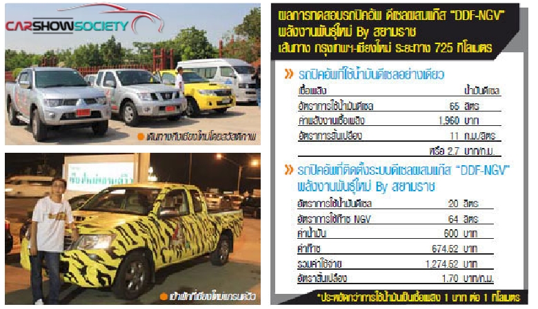 “พลังงานพันธุ์ใหม่ By สยามราช” กรุงเทพฯ-เชียงใหม่ ระยะทาง 725 กิโลเมตร นับเป็นความท้าทายครั้งสำคัญ เมื่อทีมทดสอบของบริษัท สยามราชธานี คอร์ปอเรชัน จำกัด ทำการทดสอบรถกระบะที่ติดตั้งอุปกรณ์ก๊าซดีเซลผสม NGV ระยะทางไกล ตามสภาพการใช้งานจริง บนเส้นทางกรุงเทพฯ-เชียงใหม่ ระยะทาง 725 กิโลเมตร ว่าตัวเลขอัตราสิ้นเปลืองพลังงานจะเป็นเท่าไหร่? เปรียบเทียบกับรถปิคอัพทั่วไปจะมีความคุ้มค่าแค่ไหน? การทดสอบครั้งนี้ต้องการการวัดผลที่เป็นวิทยาศาสตร์ ทีมทดสอบของบริษัท สยามราชธานี คอร์ปอเรชัน จำกัด จึงทำการทดสอบเปรียบเทียบระหว่างรถปิคอัพเครื่องยนต์ 2,500 ซี.ซี. ที่ติดตั้งอุปกรณ์แก๊สแบบผสม “ดีเซล+แก๊ส” ของสยามราชกับรถปิคอัพขนาดเครื่องยนต์เท่าๆ กันที่ใช้น้ำมันดีเซลล้วน ขับทดสอบในเส้นทางเดียวกัน สภาพถนนและสภาพการจราจรคล้ายคลึงกัน ระยะทางเท่ากัน เพื่อดูว่าจะมีอัตราสิ้นเปลืองเชื้อเพลิงแตกต่างกันมากน้อยเพียงใด รถที่ใช้ในการทดสอบมีทั้งหมด 4 คัน เป็นรถปิคอัพยอดนิยมในตลาดรถปิคอัพเมืองไทยทั้งสิ้น ได้แก่ โตโยต้า ไฮลักซ์, วีโก้ แชมป์, อีซูซุ ดีแมคซ์, มิตซูบิชิ ไทรทัน และนิสสัน นาวาร่า ทั้ง 4 คันติดตั้งอุปกรณ์แก๊สรถยนต์แบบผสม “ดีเซล+แก๊ส” ของสยามราช ส่วนรถทดสอบเปรียบเทียบเดินทางโดยใช้น้ำมันดีเซลเพียงอย่างเดียว (ระบบ“ดีเซล+แก๊ส” ของสยามราช ใช้ได้ทั้ง NGV และ LPG แต่การทดสอบครั้งนี้เลือกใช้ NGV ในการทดสอบ) การทดสอบเป็นไปอย่างราบรื่น ตลอดเส้นทางระบบแก๊สแบบผสม “ดีเซล+แก๊ส”ของสยามราช ทำงานได้อย่างสมบูรณ์สามารถตอบสนองในการขับขี่ได้ทุกรูปแบบหลังจากเดินทางถึงเชียงใหม่ รวมระยะทางทั้งสิ้น 725 กิโลเมตร คณะทดสอบได้นำรถทดสอบทั้งหมดเข้าทำการเติมน้ำมันและก๊าซจนเต็มถังอีกครั้งเพื่อวัดหาปริมาณเชื้อเพลิงที่ใช้ ปรากฏว่ารถปิคอัพคันที่ใช้น้ำมันดีเซลล้วนๆใช้น้ำมันไป 65 ลิตร มีอัตราสิ้นเปลืองเชื้อเพลิงเฉลี่ยอยู่ที่ 11 ก.ม./ลิตร เท่าๆ กับอัตราสิ้นเปลืองของรถปิคอัพทั่วๆไป จ่ายค่าน้ำมันดีเซลไป 1,960 บาท หรือเฉลี่ย2.70 บาท/ก.ม. ส่วนรถทดสอบที่ติดตั้งระบบดีเซลผสมแก๊ส “พลังงานพันธุ์ใหม่ By สยามราช”ใช้น้ำมันดีเซลไปเพียง 20 ลิตร และใช้ก๊าซ NGV ไป 64 ลิตร จ่ายค่าน้ำมัน 600 บาท ส่วนค่าก๊าซจ่ายไป 674.52 บาท รวมค่าเชื้อเพลิงสองชนิด 1,274.52 บาท เท่ากับมีความสิ้นเปลืองเชื้อเพลิง 1.70 บาท/กม.เท่านั้น ![]() ตัวเลขที่ออกมาแสดงให้เห็นว่าระบบดีเซลผสมแก๊สของสยามราชทำให้ประหยัดการใช้น้ำมันได้มากถึง 64% เมื่อนำมารวมกับค่าเติมก๊าซ NGV แล้ว สามารถประหยัดค่าเชื้อเพลิงได้เฉลี่ยสูงถึง 36% ข้อสำคัญ ผลกา
