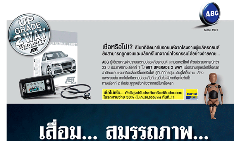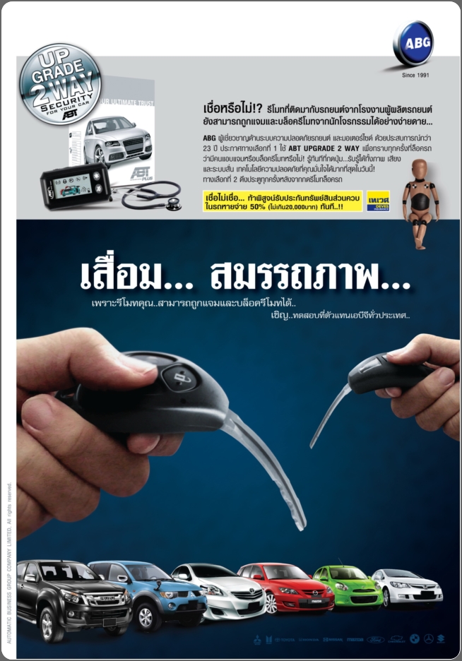 ![]() เอบีจี... ผู้เชี่ยวชาญด้านความปลอดภัยรถยนต์ และรถมอเตอร์ไซด์ กว่า 23 ปี ได้พัฒนา ระบบการอัพเกรด รีโมทรถยนต์ที่ติดมาพร้อมกับรถจากโรงงานที่ยังขาดระบบการป้องกัน หลายรูปแบบ ซึ่งสามารถเรียกได้ว่า “เสื่อมสมรรถภาพ” ในการป้องกัน วันนี้เราได้อัพเกรด โดยเพิ่มประสิทธิภาพของรีโมทให้มีระบบการป้องกันแก่รถมากขี้น เช่น ระบบอุลต้าโซนิค สามารถช่วยป้องกันเรื่องการใช้ไฟลน เผากระจกให้เกิดการร้าว แล้วทำการโจรกรรม หรือการเพิ่มระบบการตัดสตาร์ท และทำให้มีเสียงไซเรนร้อง ทันทีที่มีการโจรกรรมทุกด้าน ตลอดจนการก็อปปี้กุญแจผี เพื่อการป้องกันการโจรกรรมทางประตู ![]() วันนี้... มีเพิ่มการระบบป้องกันการแจมรีโมท โดยให้เจ้าของรถทราบทันทีที่ล็อคประตูรถทุกครั้งว่า มีการแจม... รีโมทในบริเวณที่จอดหรือไม่ หากมีการแจมสัญญาณรบกวนรีโมทจะทำให้ทราบได้ทันทีด้วย ภาพ และเสียง ตลอดจนระบบสั่น โดยไม่มีวันพลาดเปิดโอกาสให้การแจมรีโมทสามารถโจรกรรมทรัพย์สินอันมีค่าในรถคุณ ด้วยผลิตภัณฑ์ “ABG UPGRADE TWOWAY” พร้อมทั้งเสริมอานุภาพการรับรู้การบุกรุก กรณีเจ้าของรถอยู่ห่างตัวรถระยะ ภายใน 1,000 ฟุต (300เมตร) โดยส่งสัญญาณภาพ เสียง และระบบสั่นให้เจ้าของรถทราบทันที ทุกเวลา อีกเช่นกัน ![]() เอบีจี ขอท้าให้ลอง! ด้วยความมั่นใจว่า เราเป็นรายแรกเจ้าเดียวที่มีระบบ UPGRADE TWOWAY ในประเทศไทย โดยร่วมกับ บริษัท เทเวศ ประกันภัย ในเครือทรัพย์สินพระมหากษัตริย์ มอบกรมธรรม์คุ้มครองรถหายจ่าย 200,000 บาท มูลค่ารวม 740,000 บาท และคุ้มครองอุปกรณ์ทรัพย์สินในรถส่วนควบหายจ่าย 50% ไม่เกิน 20,000 บาท เรากล้ารับประกัน! เพราะเราคือผู้เชี่ยวชาญด้านความปลอดภัยของรถยนต์จากการโจรกรรม เราต้องหาทางป้องกัน ช่วยให้ท่านเจ้าของรถสามารถป้องกันรถที่คุณรัก และรู้ว่ามีการแจมรีโมทเกิดขึ้นกับรถคุณ รวมทั้งเช็คสถานะความปลอดภัยได้อย่างง่ายๆ วันนี้... สอบถามรายละเอียดได้ที่ตัวแทนจำหน่ายทั่วประเทศ และสาขาบริการ ABG AUTO SHOP ทั่วประเทศ เชิญรับบริการทดสอบสาธิตว่า รีโมทที่ติดมาพร้อมวันออกรถป้ายแดงของคุณปลอดภัยจากการแจมรีโมทหรือไม่?... ติดต่อสอบถามเพิ่มเติม Call Center โทร. 0-2369-2844-5 / www.abg.co.th |